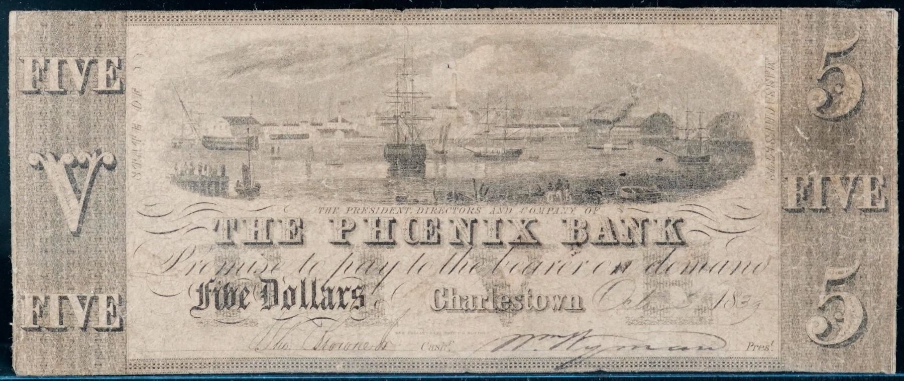USA Oboslotete Banknote; Phoenix Bank (Charlestown) 1839 $5 - Harbour Scene. VF for issue.