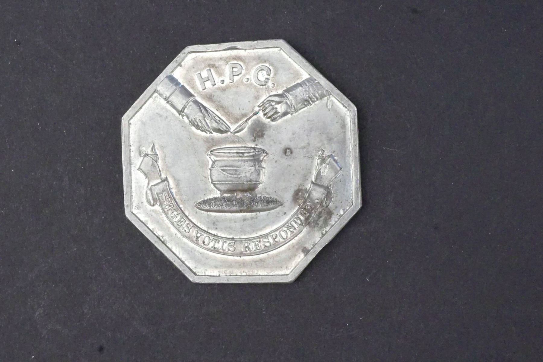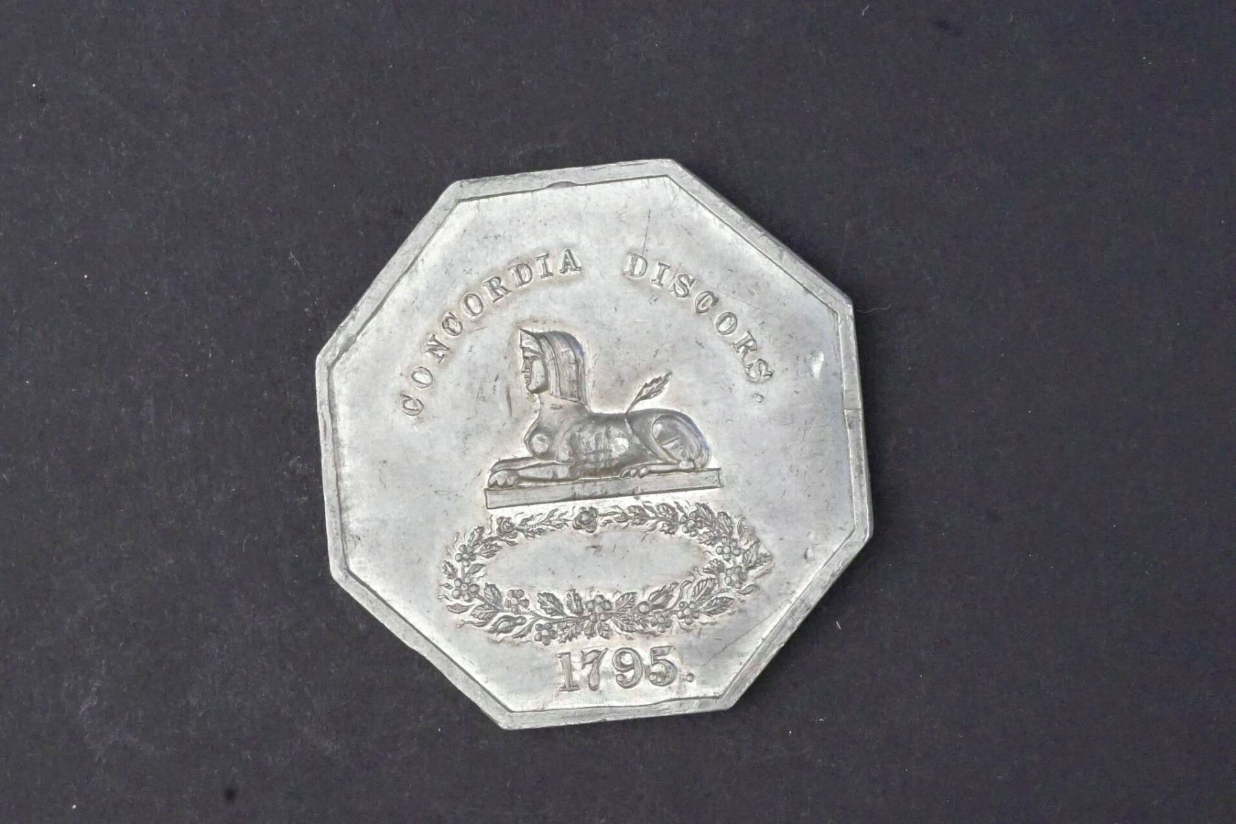White metal, 40 mm, 15.0 grams. Obverse: H. P. C. above two hands adding ingredients into a pot, at center. Below, on a ribbon, SEGES VOTIS RESPONDET. Reverse: CONCORDIA DISCORS Sphynx at center, wreath below, at bottom, 1795.Fabric has slight bend, possibly as struck. Small area of dark stain on obverse, otherwise EF/AU.