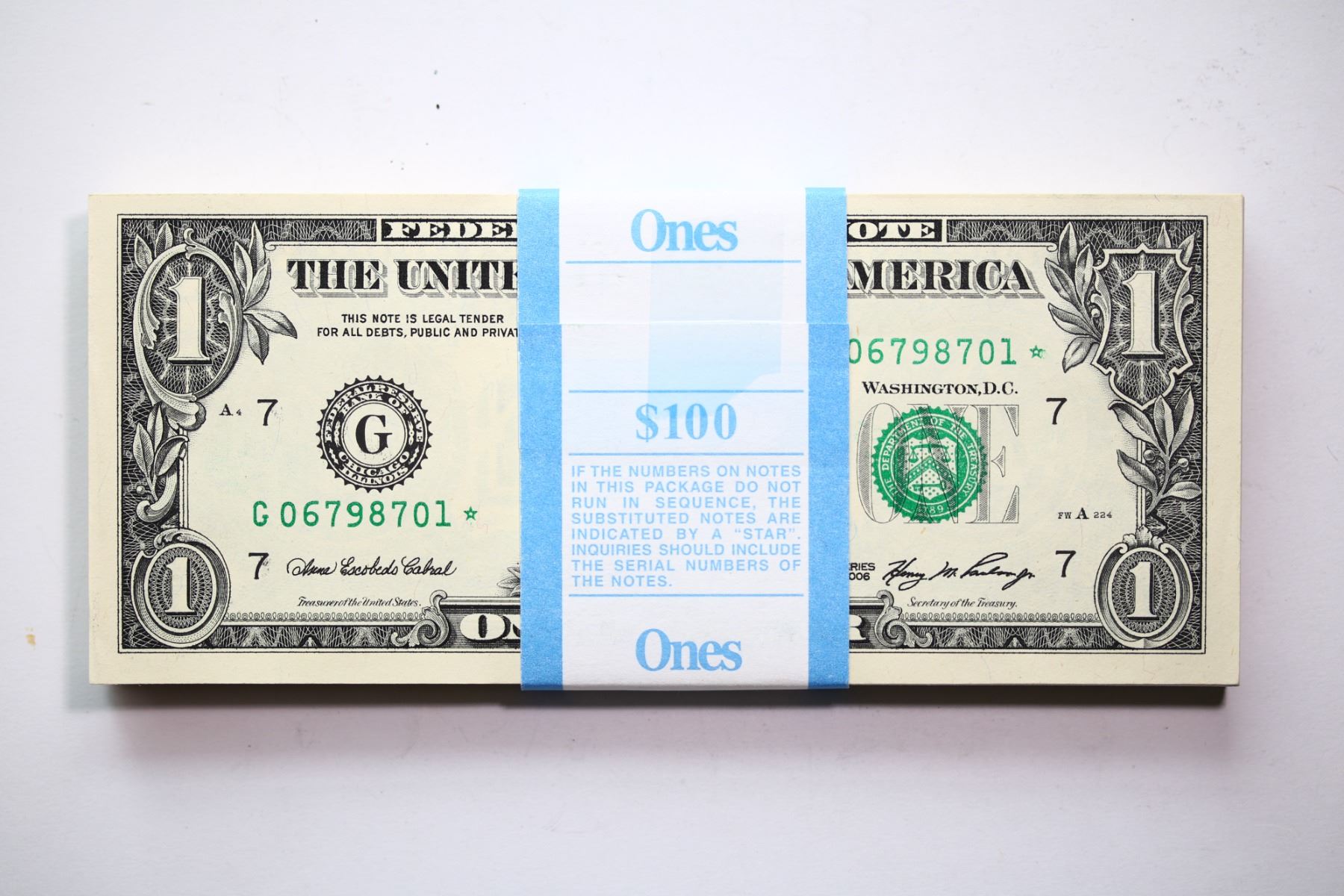 USA; Original Bundle of 100 "Replacement" notes with bank wrap 2006 $1/Green seal All Unc or better.