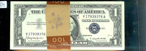 USA, Original bundle of "Silver Certificate" notes $1 1957B "Blue seal" V17939376A to V17939475A. All 100 notes are Choice unc. To Gem unc.