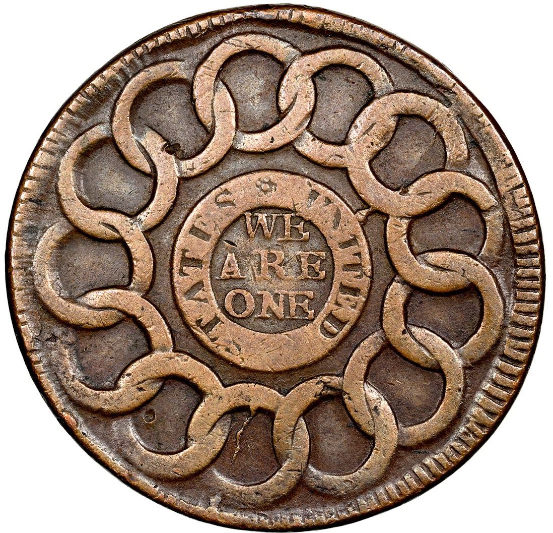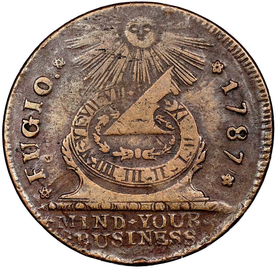 USA (Philadelphia Mint), copper Fugio cent, 1787, four cinquefoils, pointed rays, STATES UNITED, NGC VF 30 Brown. Attractive example of this early American coinage designed by Benjamin Franklin himself. The obverse depicts a radiant sunface over a sundial with FUGIO and 1787 flanking and the motto MIND YOUR BUSINESS below; the reverse depicts a great chain of 13 links representing the 13 colonies around a ring with UNITED STATES and WE ARE ONE at center. Modestly circulated example with nice design details showing including especially bold date and FUGIO, great surface quality with rich dark brown toning around the legends and devices.