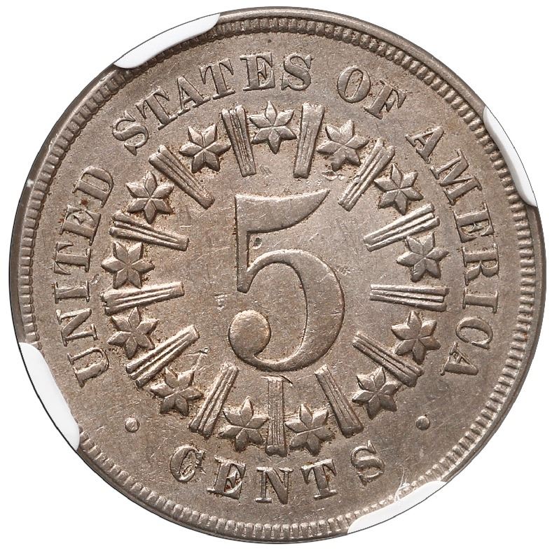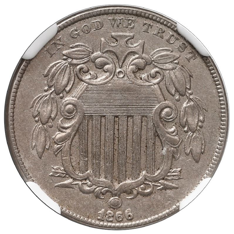 USA (Philadelphia Mint), nickel 5 cents, 1866, with rays, NGC AU 55. Popular first year of issue for the design. Lightly handled with golden toned lustrous surfaces. CPG value (in AU 55): $273. Please use this link to verify the certification number