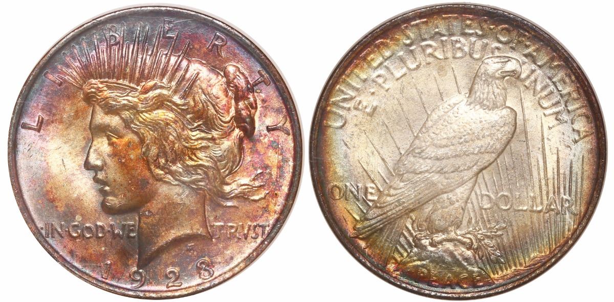 USA (Philadelphia mint), $1 Peace, 1923, encapsulated NGC MS 64. KM-150. Muted luster and minor bagmarks, but highly interesting with rainbow toning on all of obverse and at rim on reverse (rare on this issue).