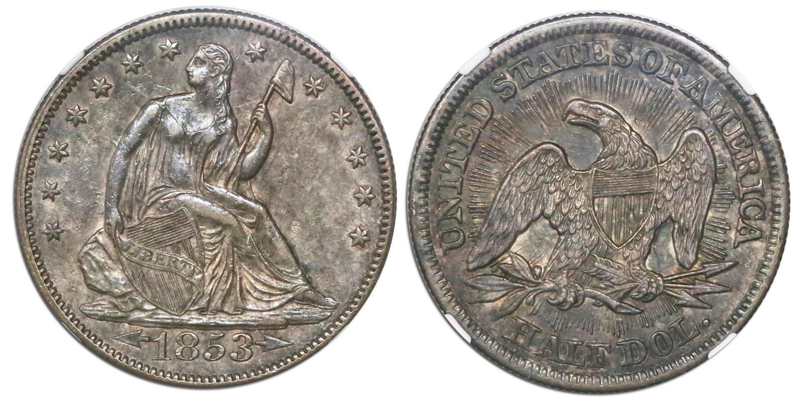 USA (Philadelphia mint), half dollar seated Liberty, 1853, arrows and rays, encapsulated NGC AU 55. KM-79. 12.44 grams. Lightly marked example with darker rainbow toning throughout. NGC #2713838-013