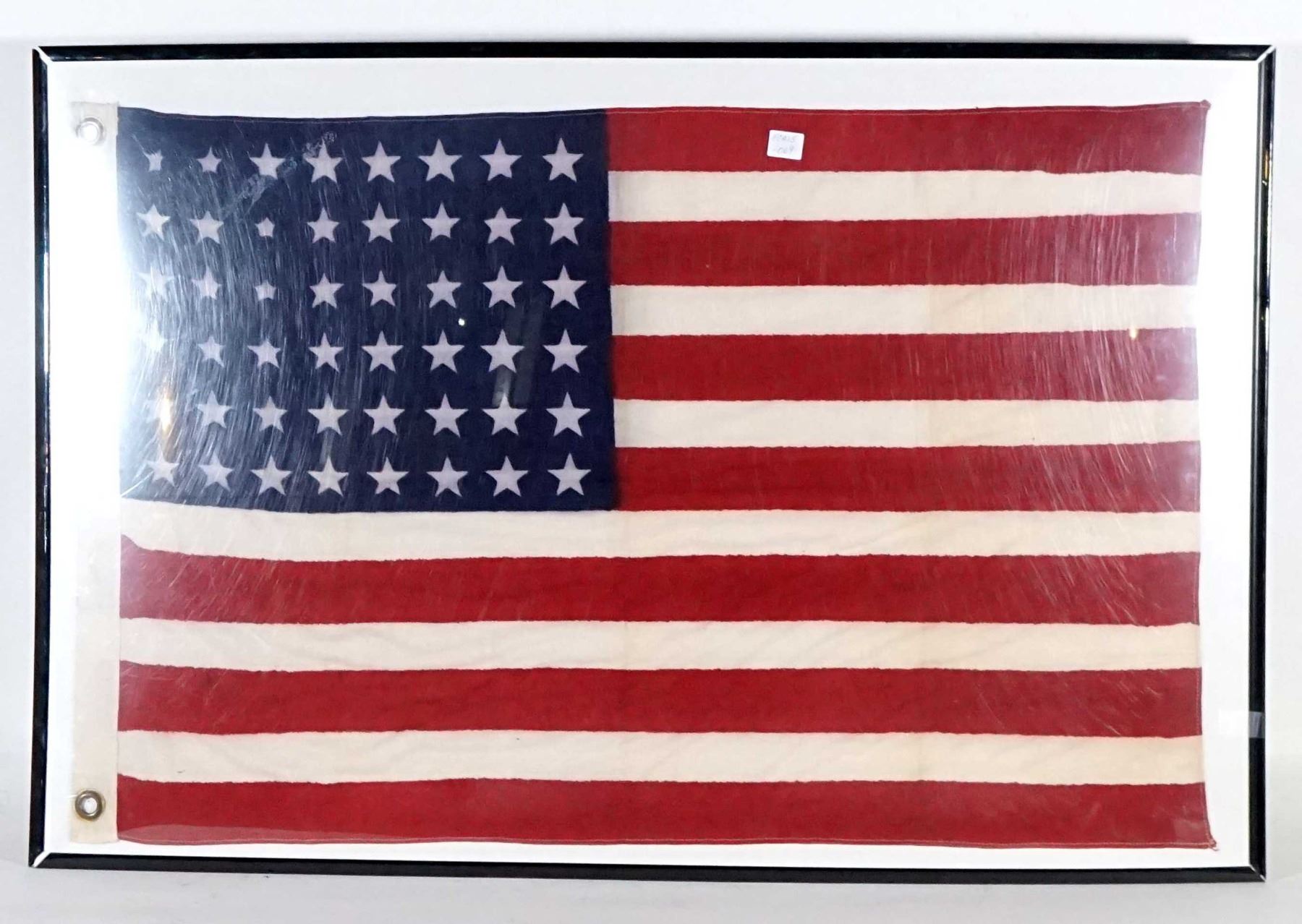 34 x 21 Inch Pre-1959 wool Flag with 2 brass grommets. 2 colour silk screen 48 star example in 36 x 24 inch plastic frame. This style of flag was used by non-military groups like the Boy Scouts. Extra Fine condition.
