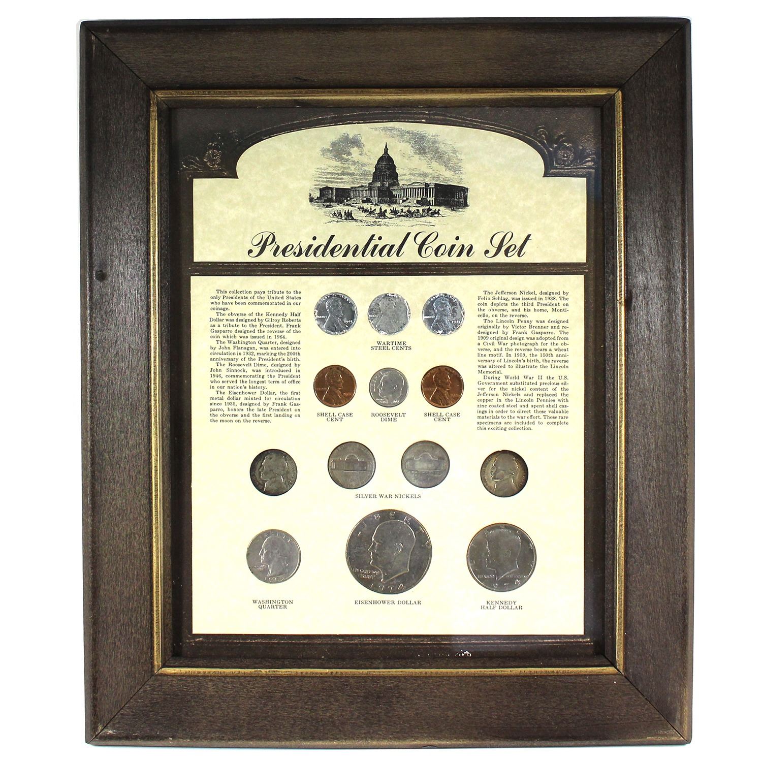 *USA Presidential Coin Set of 13x Coins in Wooden Display Frame. Includes: 3x Wartime Steel Cents, 2x Shell Case Cents, 4x Silver War Nickels, Roosevelt Dime, Washington Quarter, Kennedy Half Dollar, & Eisenhower Dollar. Coins have been naturally toned