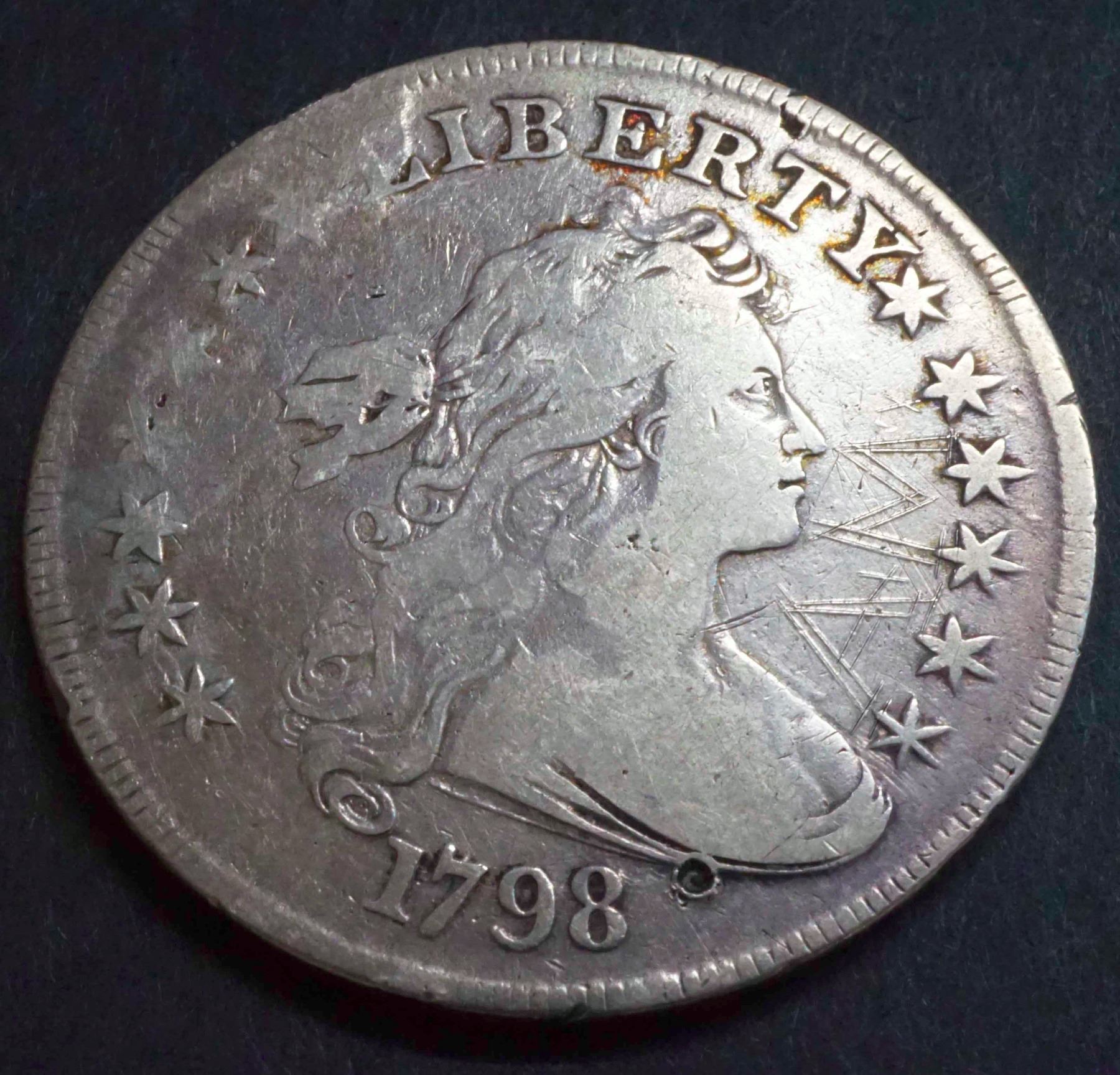 USA Silver Dollar 1798 Nice Sharp Date, but Significant Graffiti