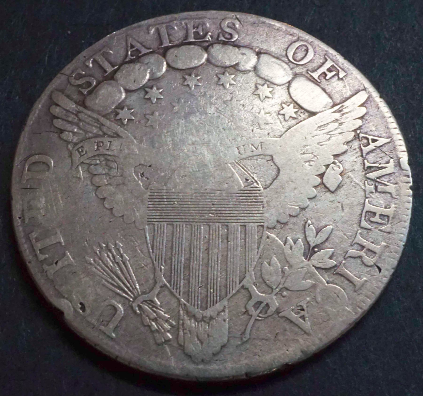 Uneven wear, or perhaps unequal strike, evidence of polishing, eagle's head worn smooth, serious graffiti in right obverse field. Pointed 9, close date.