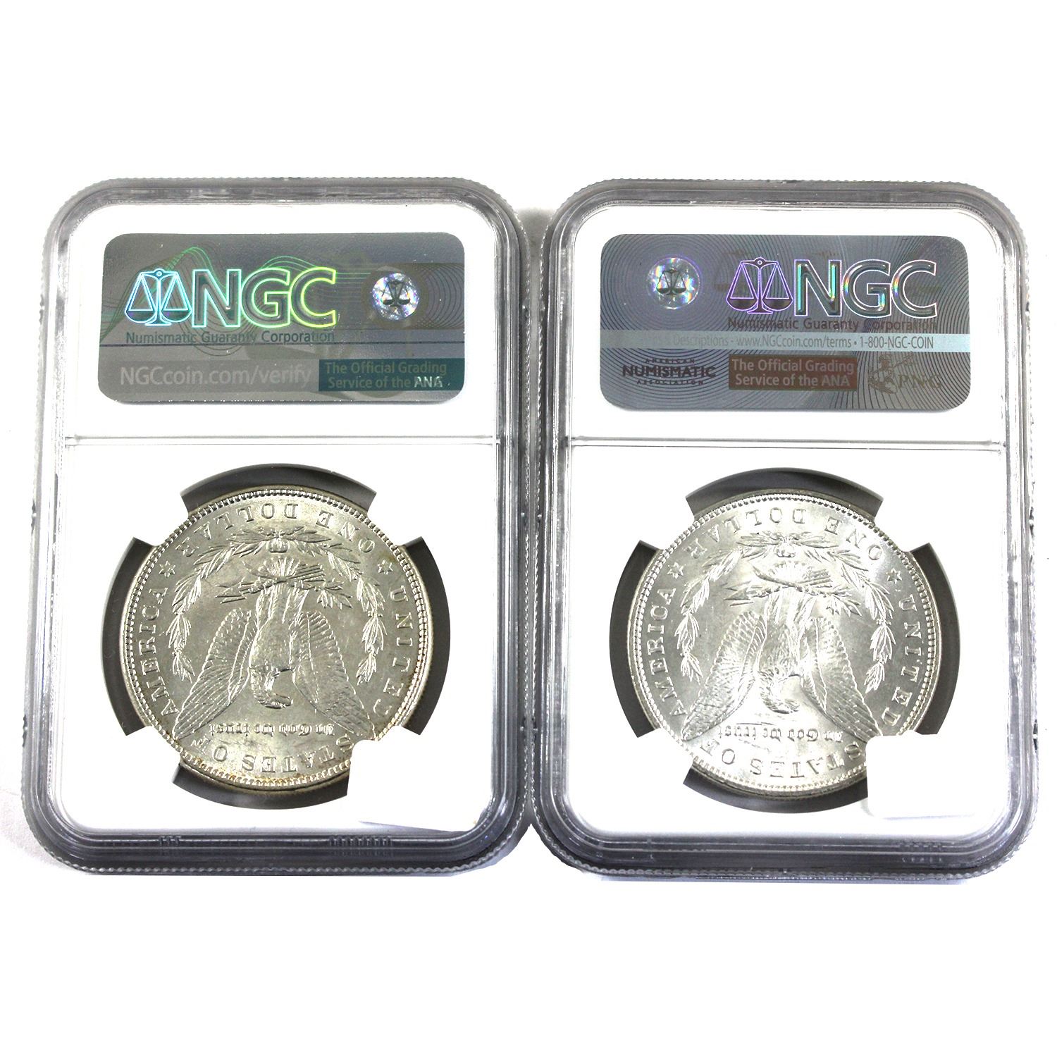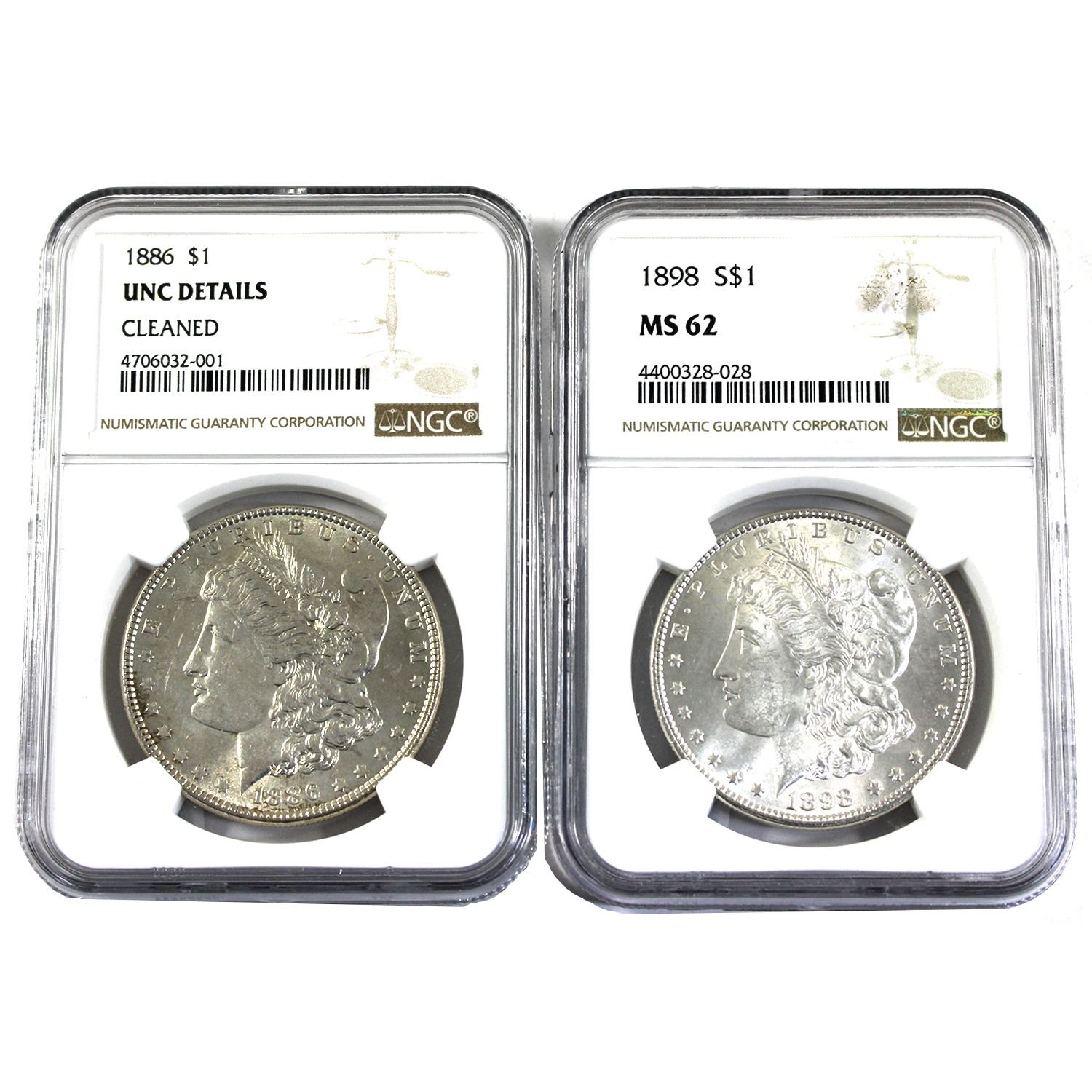 USA Silver Morgan Dollar 1886 UNC Details (clnd) & 1898 MS62 NGC Certified. A Bright Attractive Pair! Coins are Each .900 Fine and Contain 0.773ozt. 2pcs.