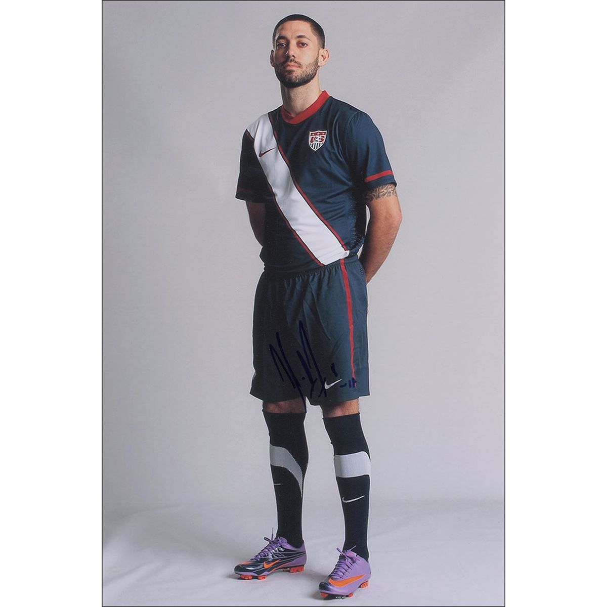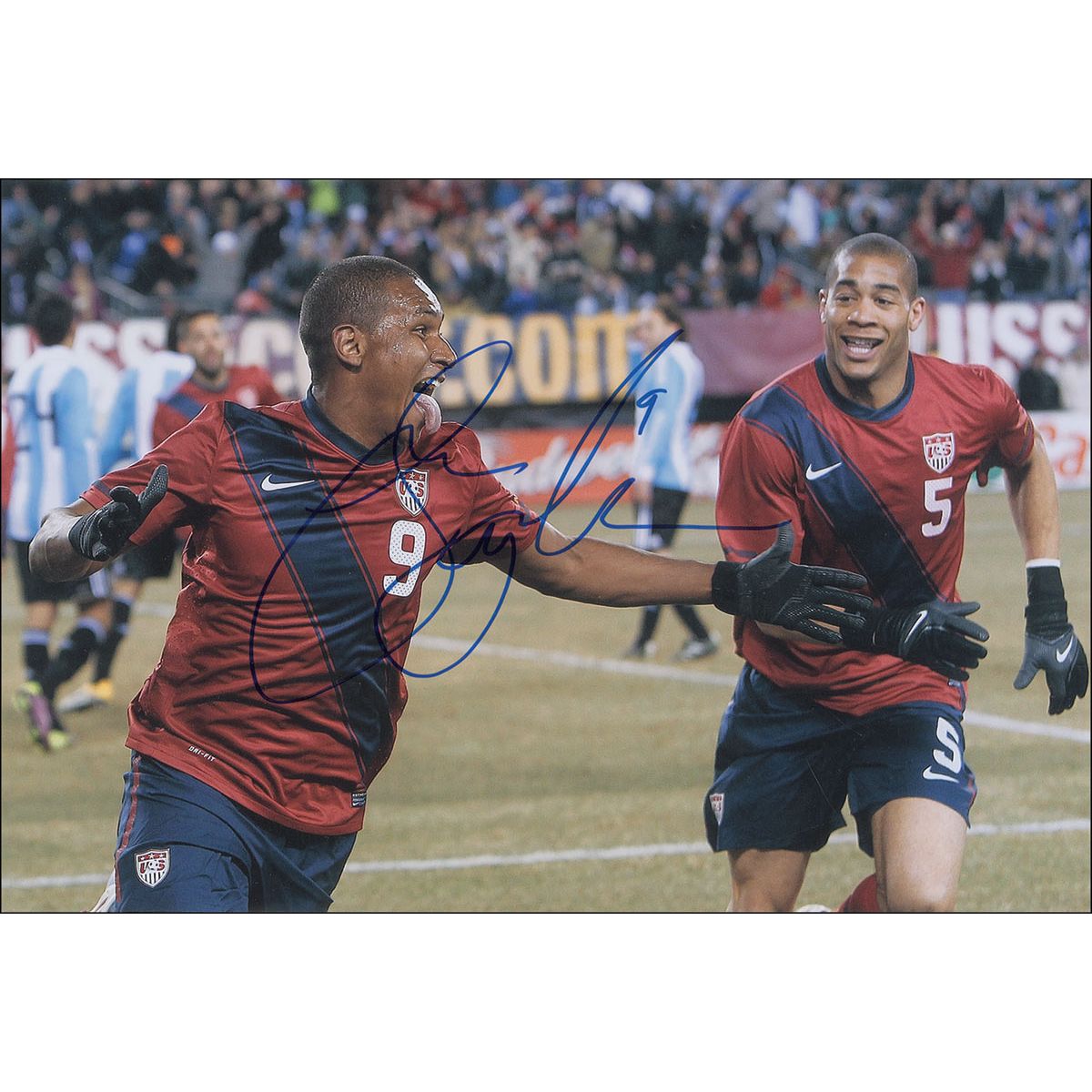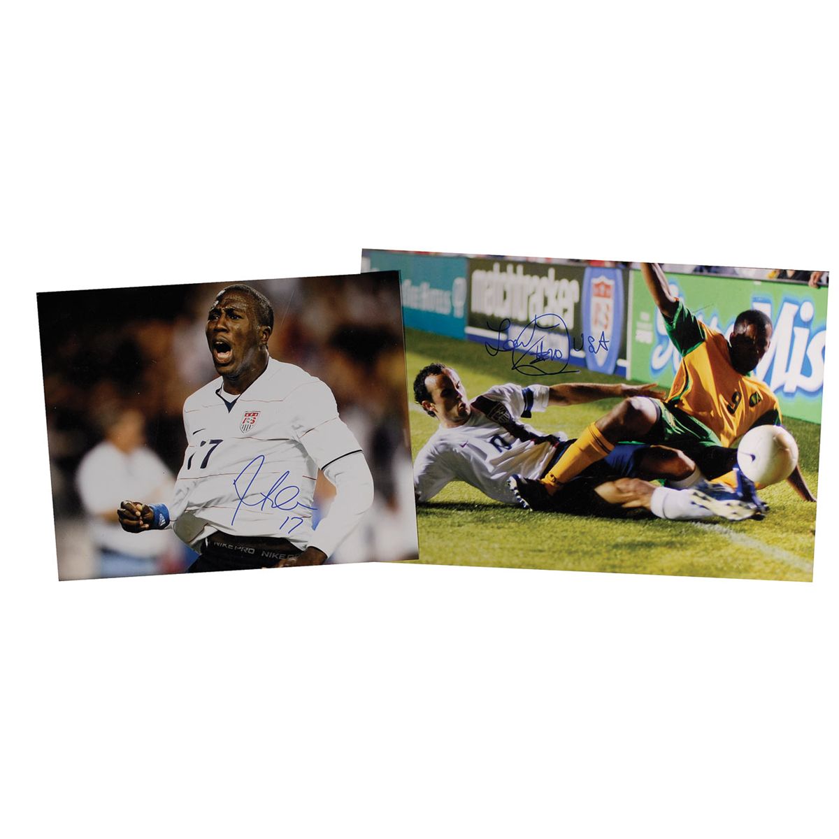 Four photos, each color satin-finish and signed in blue felt tip: 8 x 12 of Clint Dempsey in uniform; 12 x 8 of Juan Agudelo sticking his tongue out in victory on the field; 14 x 11 of Jozy Altidore; and an 18 x 12 of Landon Donovan. In overall fine condition, with heavy contrast to Dempsey’s signature.