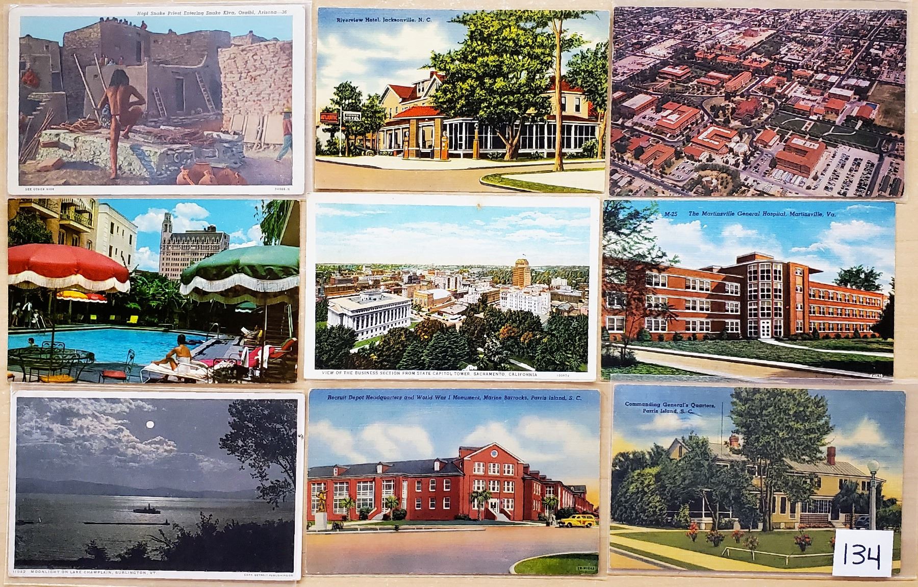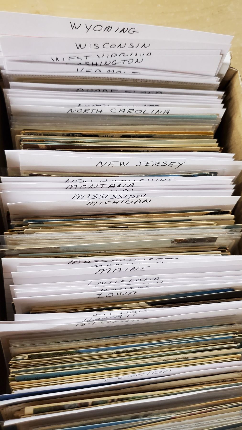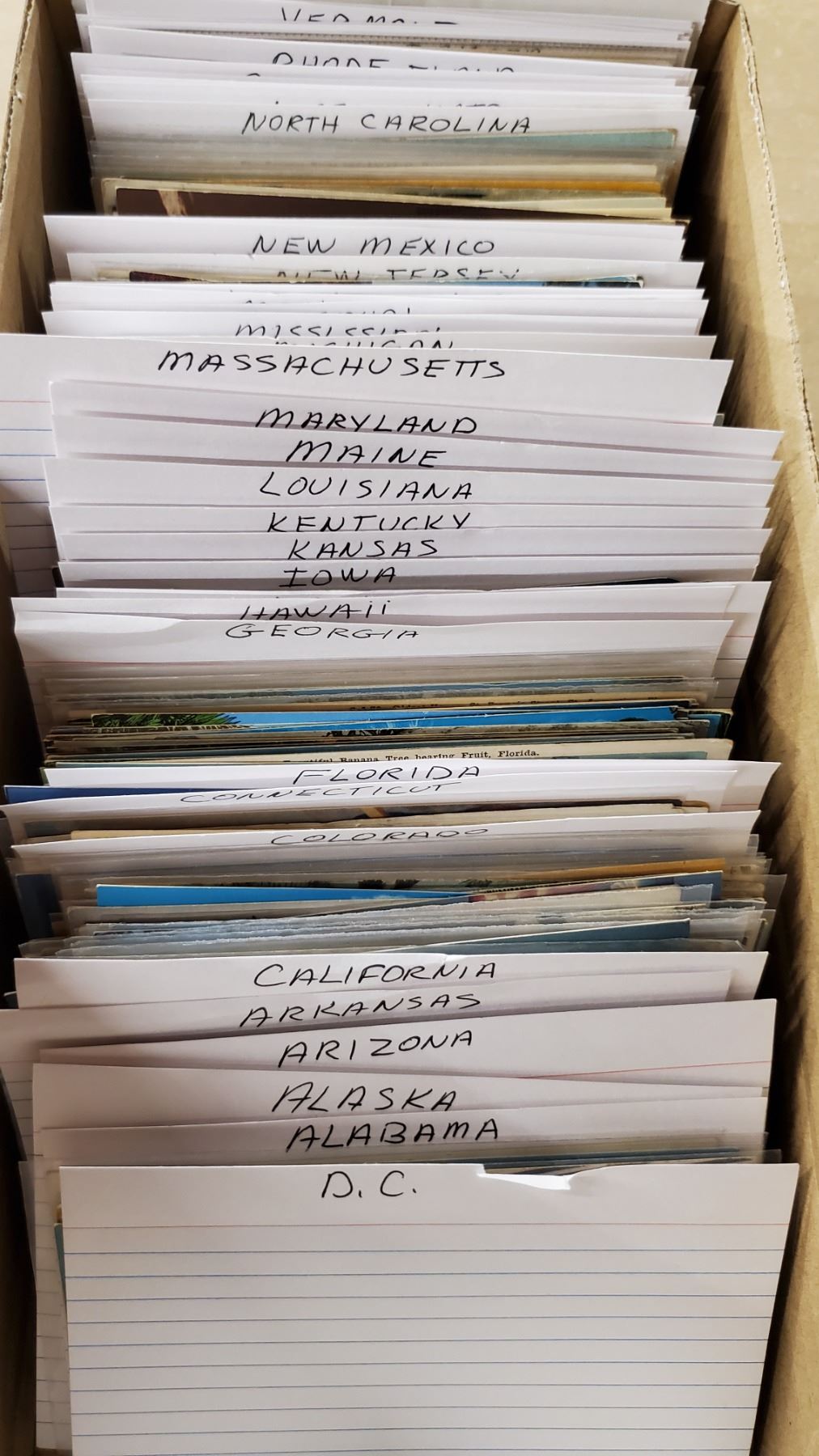 Mostly sorted USA box, over 400 postcards. Early to standard size chrome.