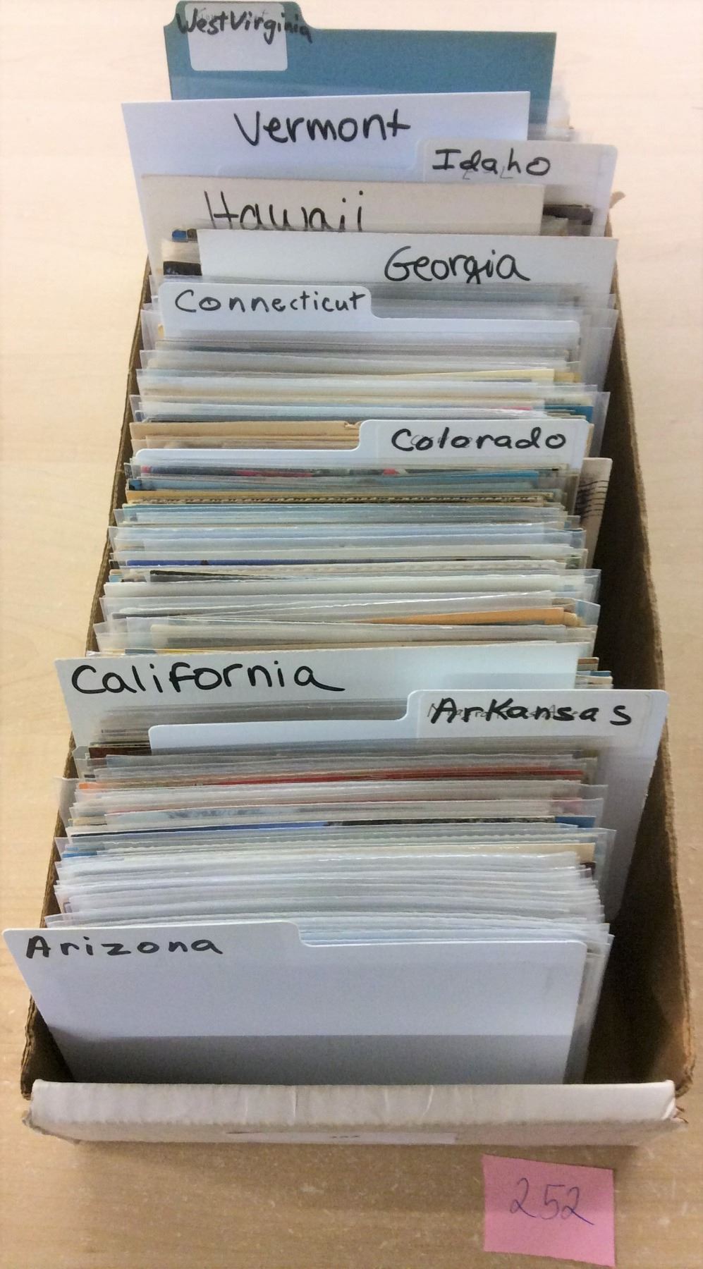 Approx. 700 postcards, mostly sorted. Sorted into: Arizona, Arkansas, California, Colorado, Connecticut, Georgia, Hawaii, Idaho, Vermont & West Virginia. Early to standard size chrome.