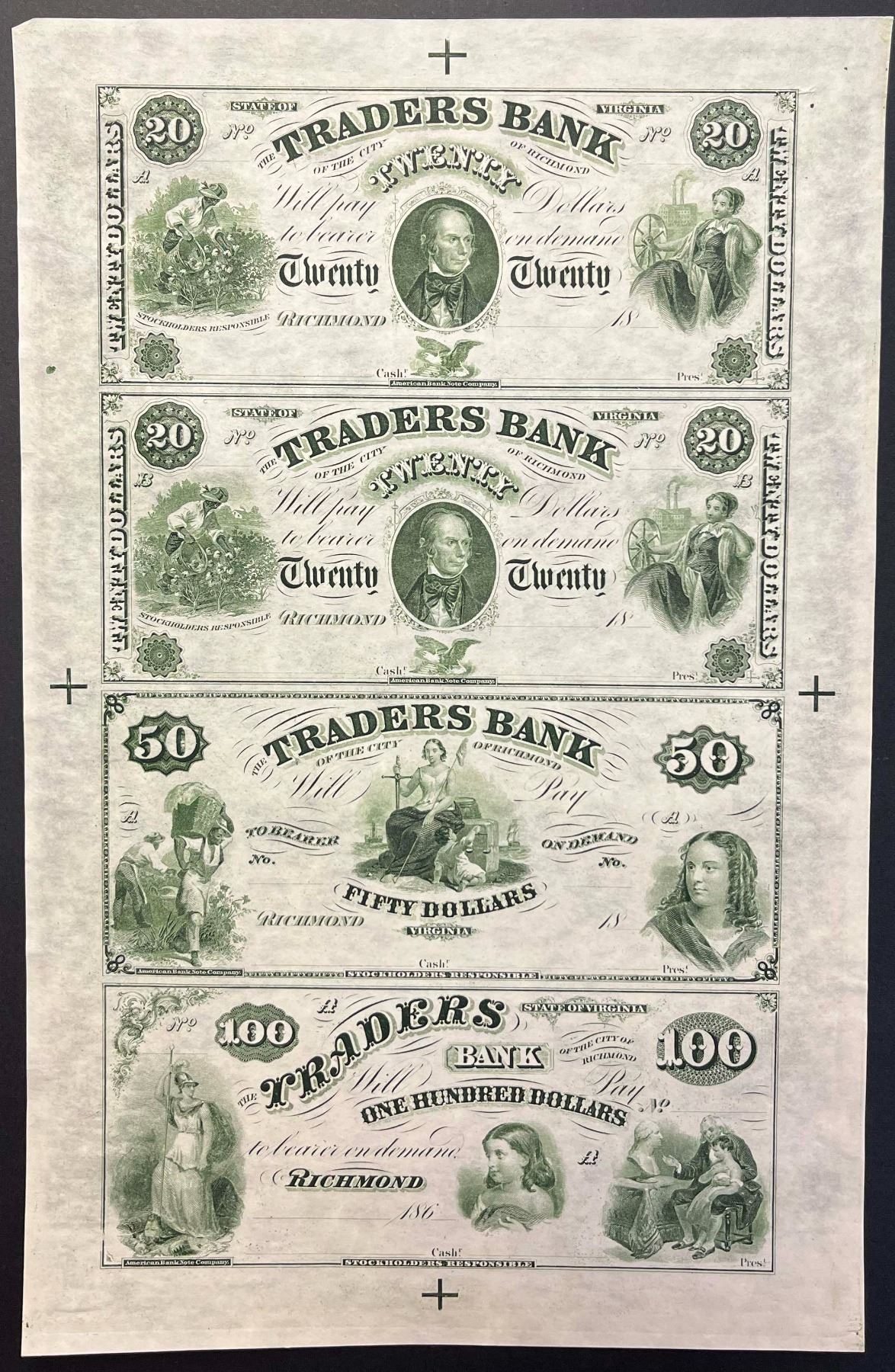 USA; The Traders Bank Uncut Sheet of 4 notes 18__ $20(2), $50 & $100 issues.
