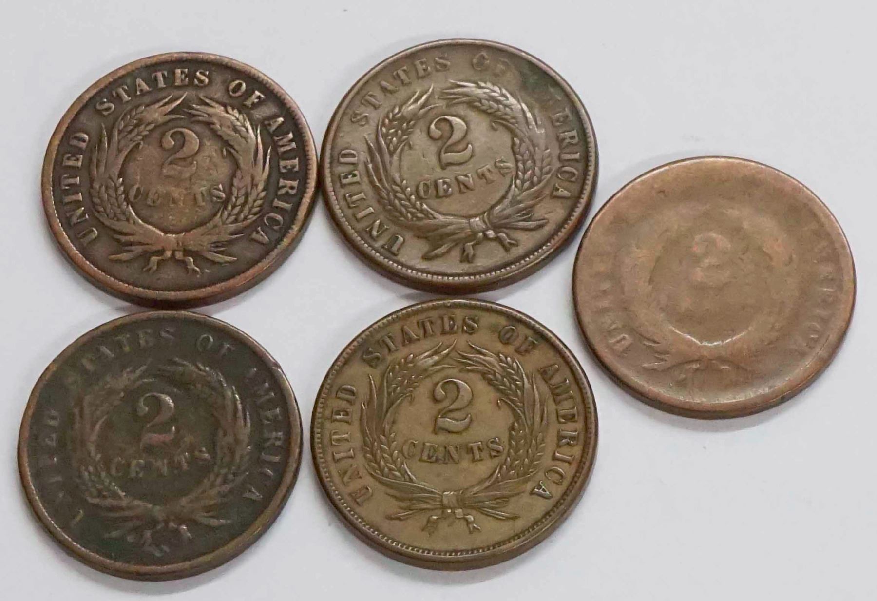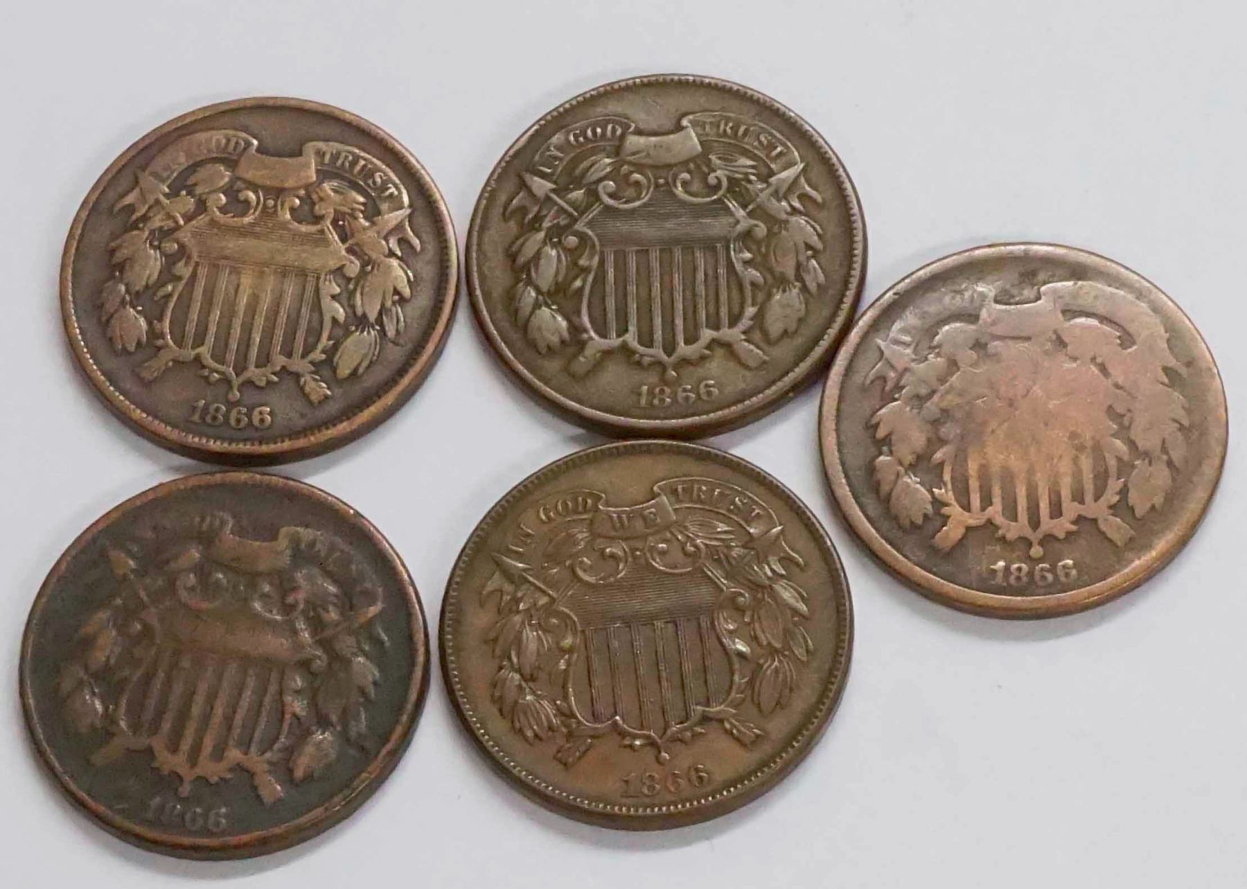 USA Two Cent Pieces 1966 Lot of Five coins, Mixed Grades, AG - EF