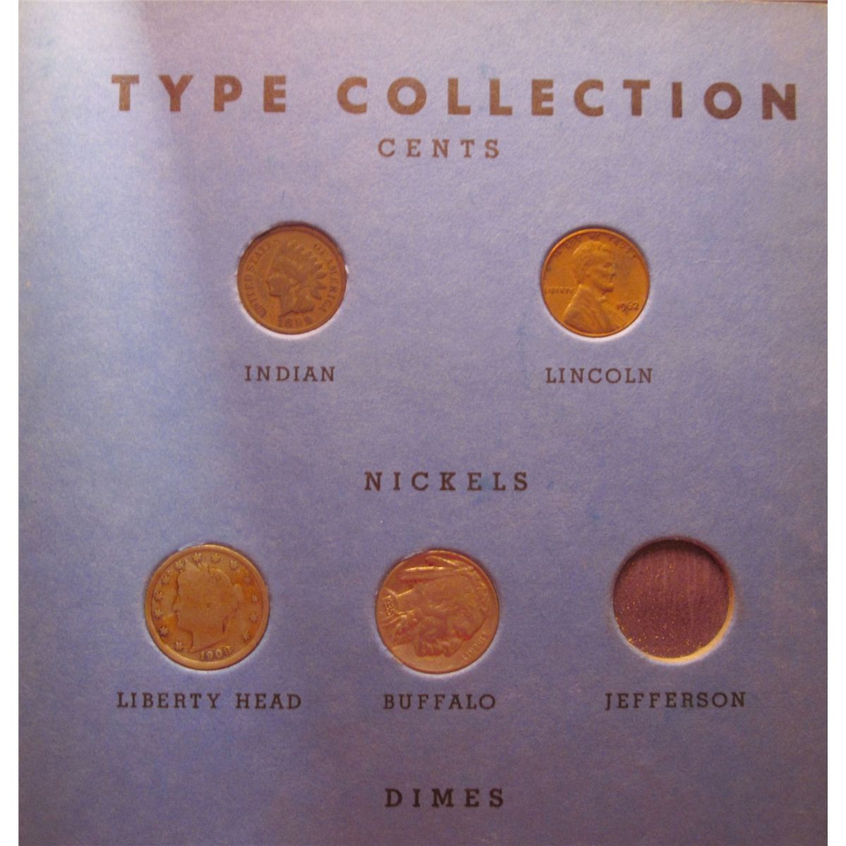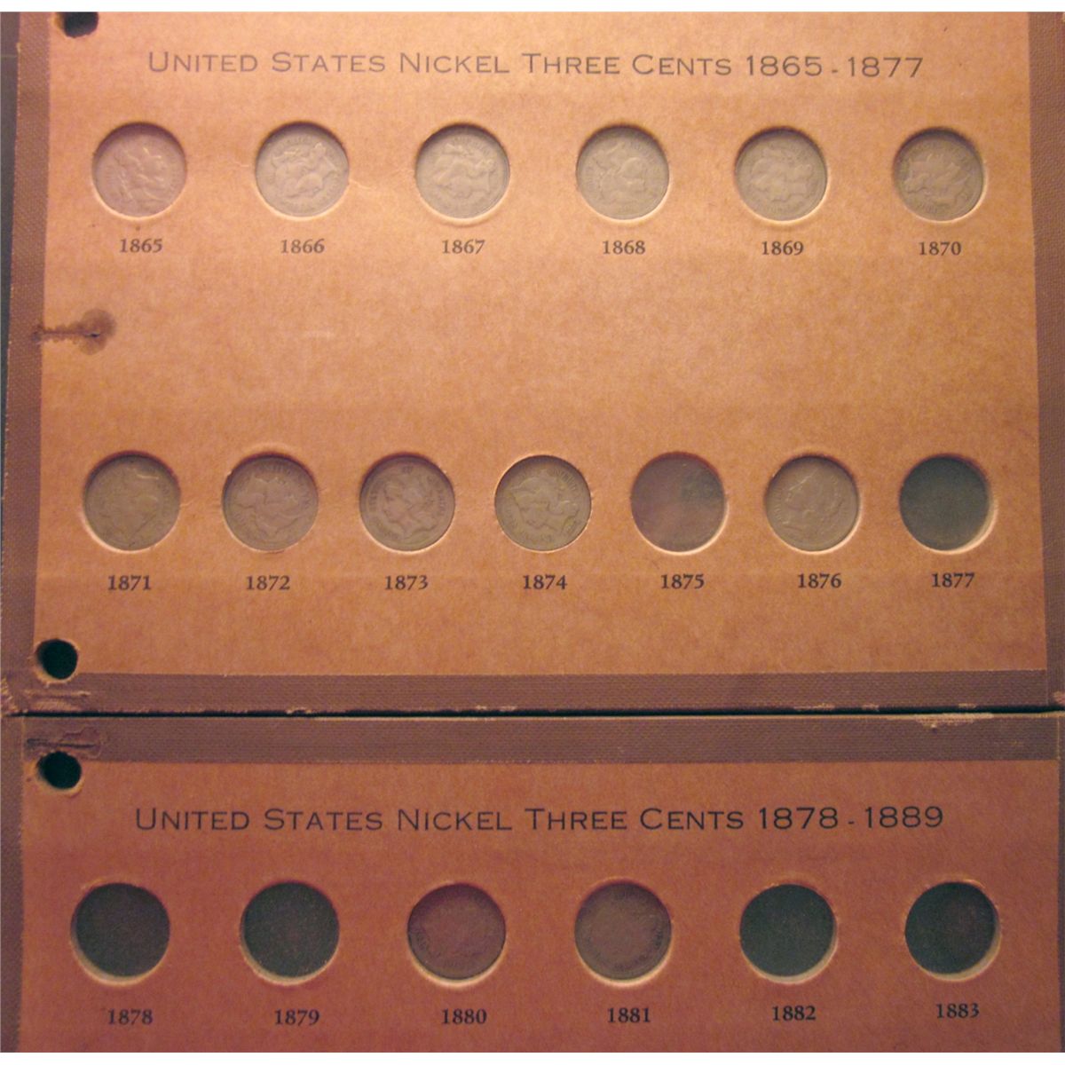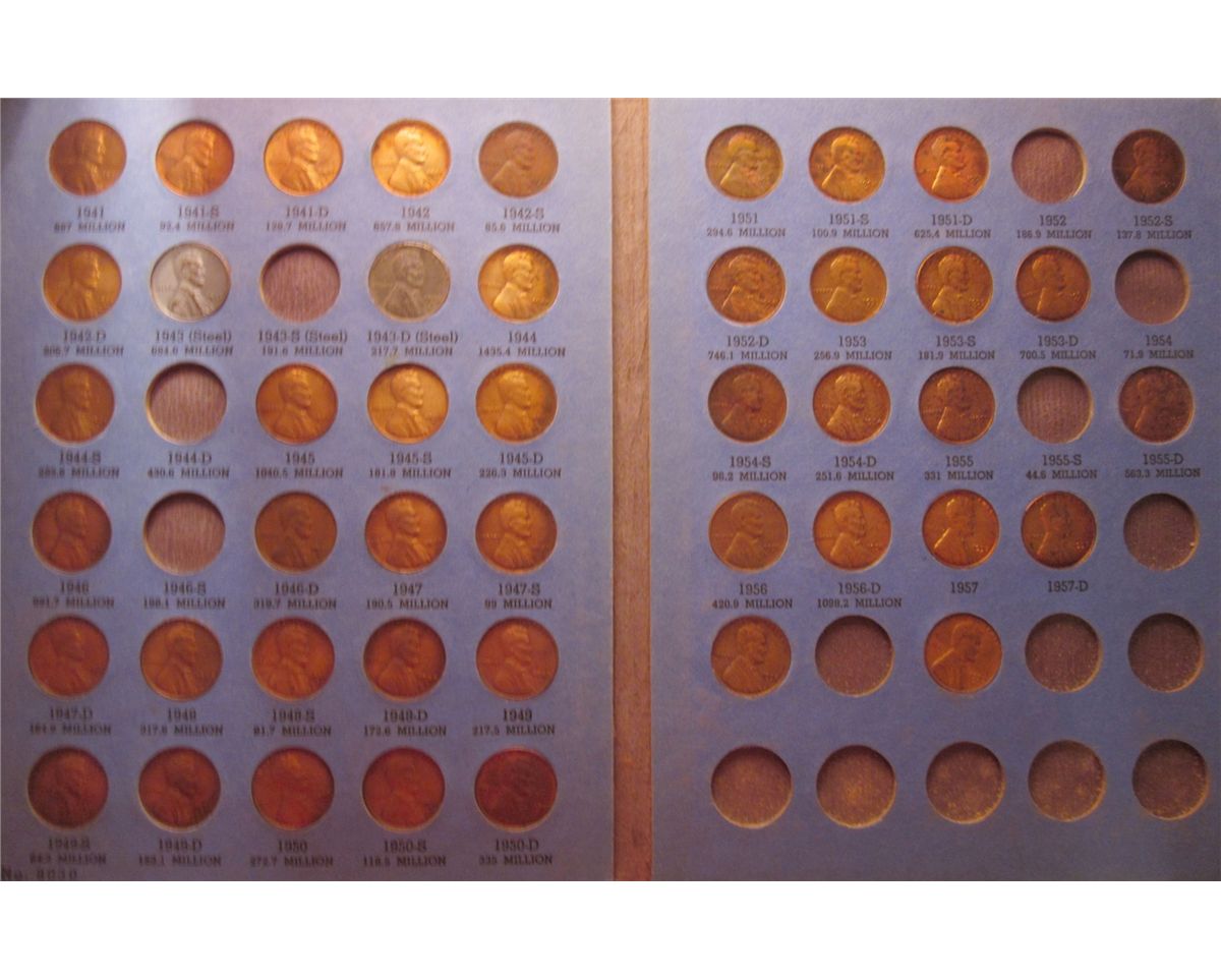 USA; Whitman album 1941 to 1959 missing some date/mint marks (45 coins) circulated and uncirculated few cleaned, Whitman Type set album with Indian cent 1899 and Lincoln cent 1962D, Liberty nickel 1908 & Buffalo nickel 1935 all circulated, 3 cents Nickel set including 1865, 1866, 1867, 1868, 1869, 1870, 1871, 1872, 1873, 1874, 1876, 1880 & 1881 in holder VG to VF. Lot of 65 coins.