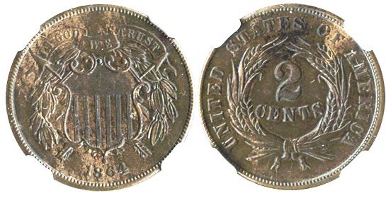 USA, copper 2 cents, large motto, 1864, encapsulated NGC MS 63 BN.