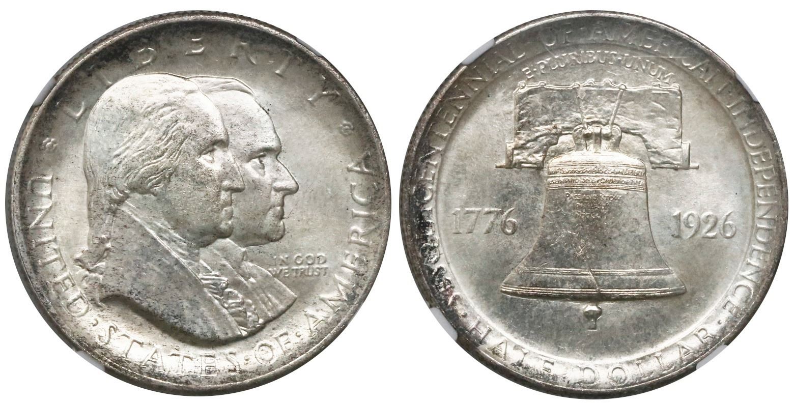 USA, half dollar commemorative, 1926, American Sesquicentennial, encapsulated NGC MS-63. KM-160. Bright and lustrous with faint gold toning throughout. NGC #4442228-005.