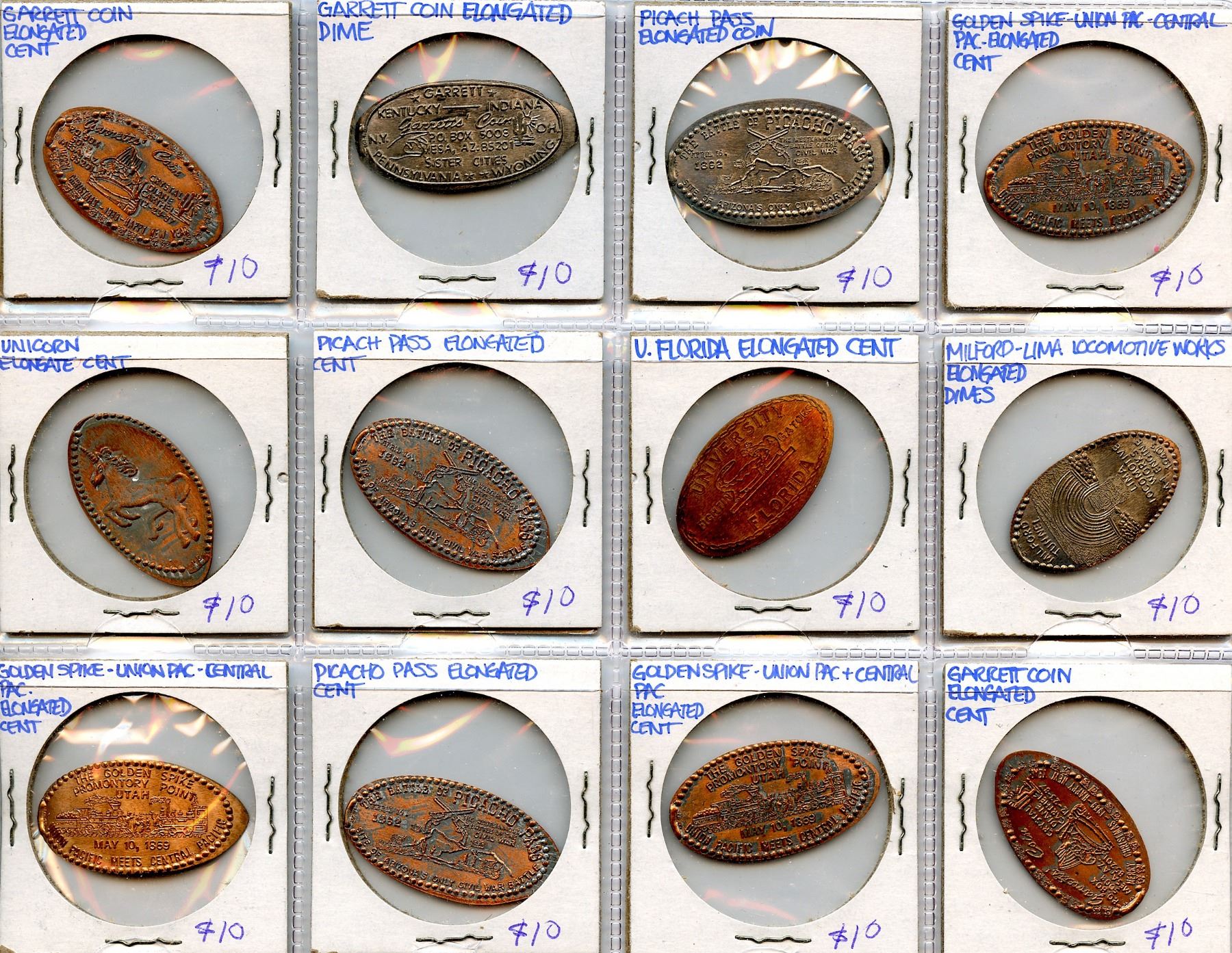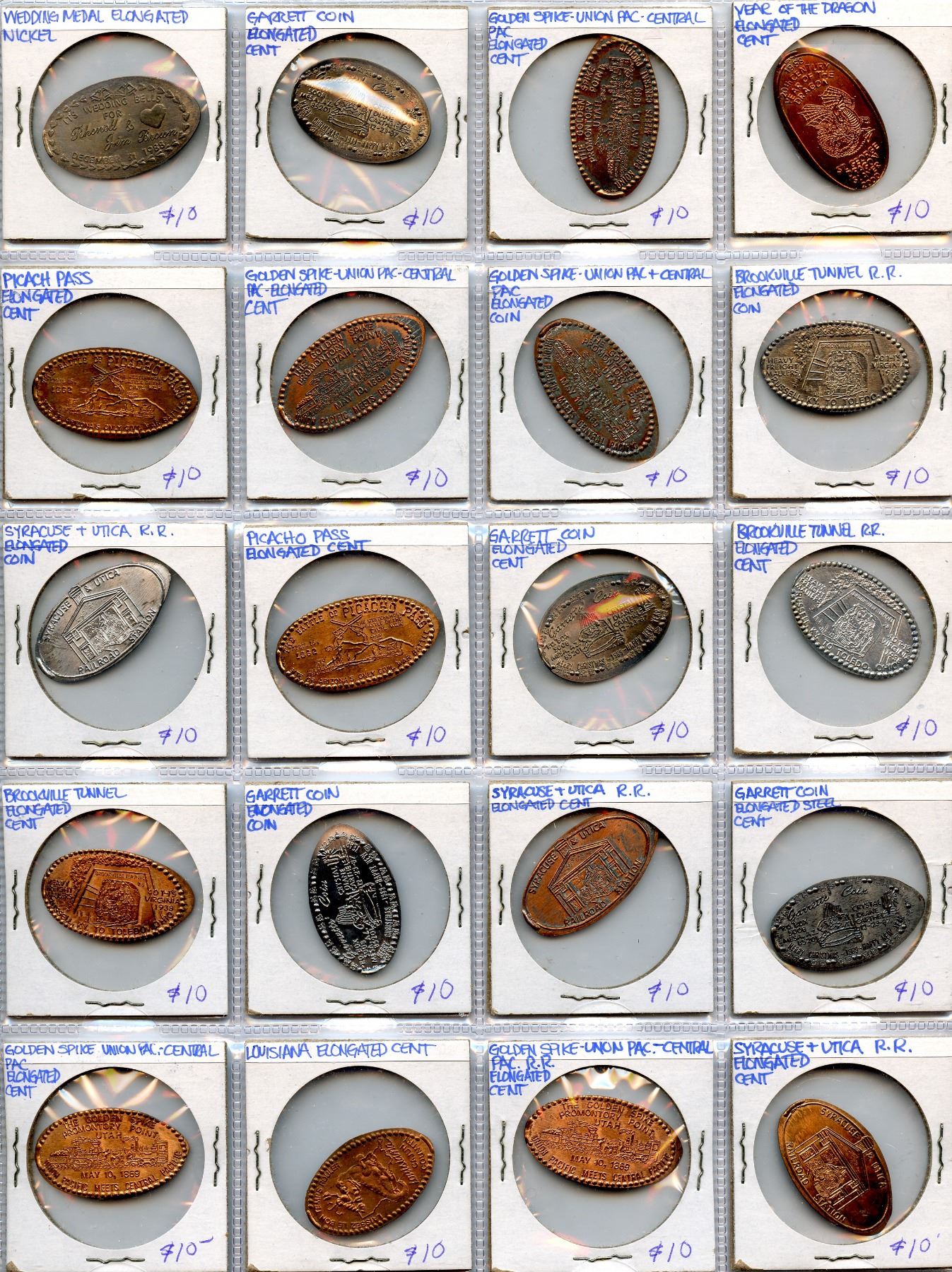 USA; lot of 32 elongated engraved cent, nickel and dime mainly from USA but include some foreign coins (UK, Canada, Mexico, etc).