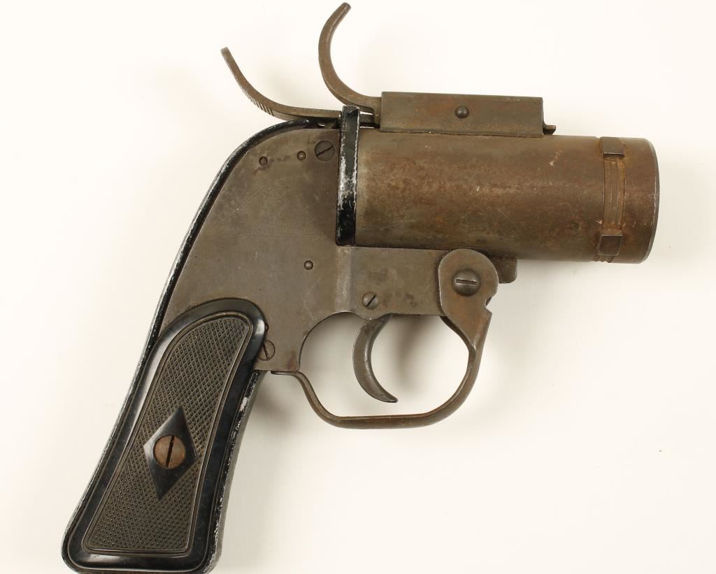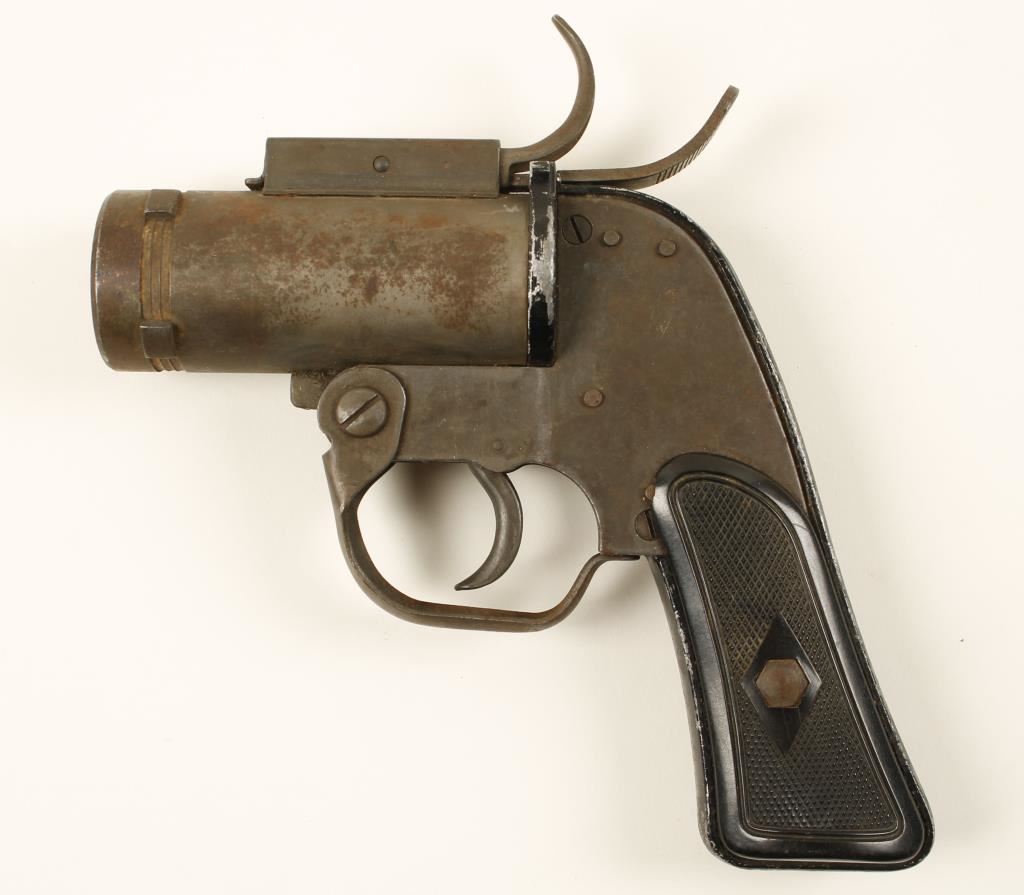 AN_M8 flare gun made by McInerny Spring and Wire Company and marked "MSWC U.S. Property Pistol Pyrotechnic M-8" in a triangle on the right side. Has lugs on the barrel for locking into firing ports on aircraft. Finish is fading and has some surface rust.