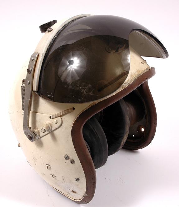 USAF, P-4A Jet Helmet. This classic helmet was introduced in the mid 1950s for use in fighter and bomber aircraft. It was declared obsolete in 1964. The helmets were issued with external visors that used a center locking track. Although missing its oxygen mask and most of its hardware, this helmet does have a clear USAF Insignia on the interior suspension system. This helmet shows the ravages of time but, with the exception of deterioration of the leather edging around the helmet edges, it is a great representative example of this early helmet.