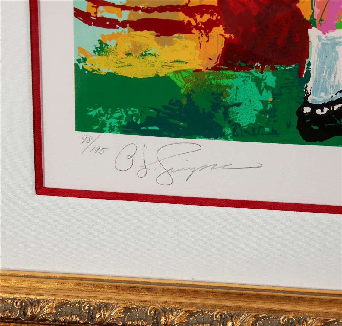 This limited edition #98 of 195 serigraph is pencil signed by world famous artist LeRoy Neiman and O.J. Simpson, the individual pictured in this piece!! LeRoy Neiman was an American artist known for his brilliantly colored, expressionist paintings and screen prints of athletes, musicians, and sporting events. 45" x 53" framed.