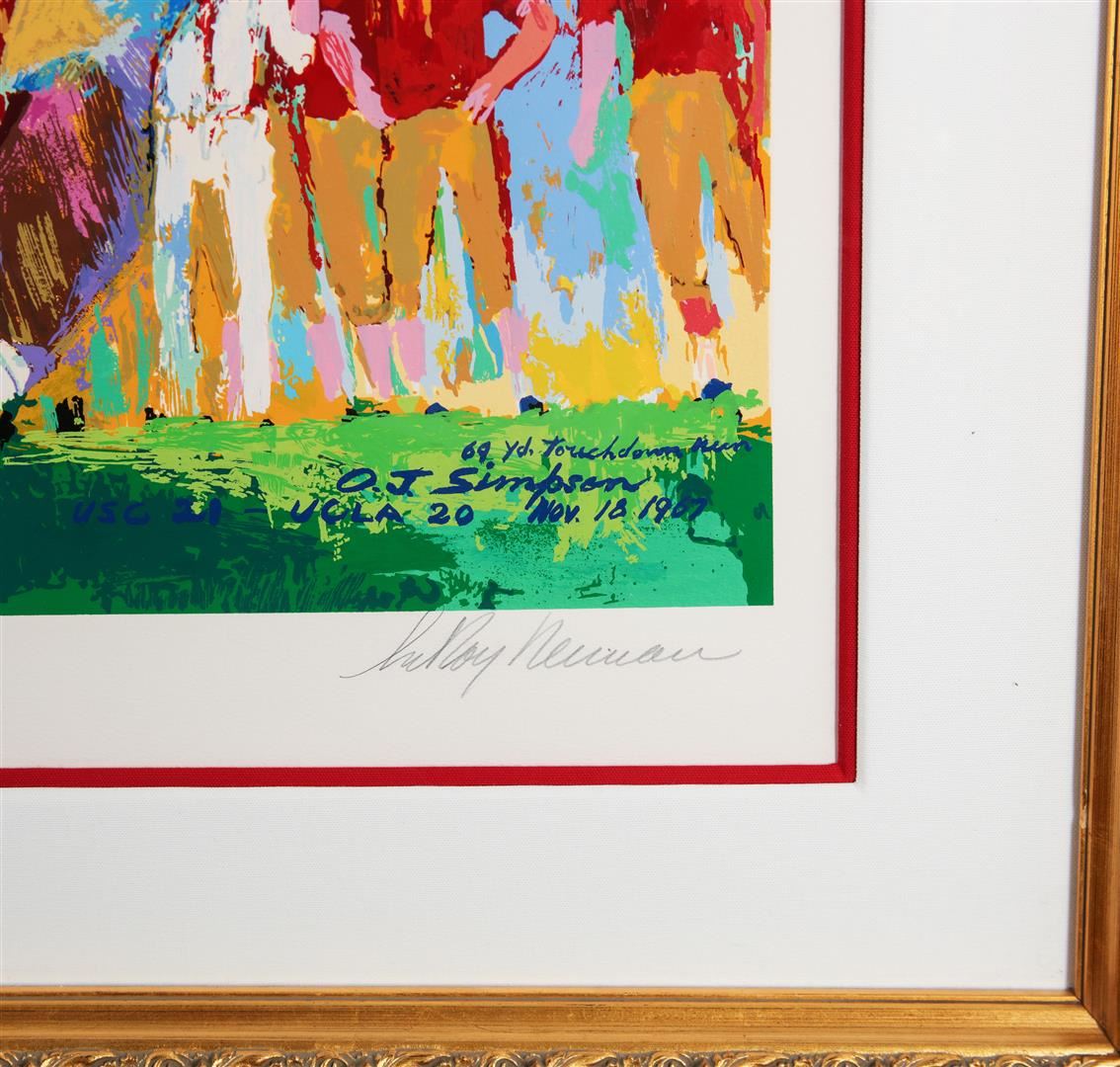 This limited edition #98 of 195 serigraph is pencil signed by world famous artist LeRoy Neiman and O.J. Simpson, the individual pictured in this piece!! LeRoy Neiman was an American artist known for his brilliantly colored, expressionist paintings and screen prints of athletes, musicians, and sporting events. 45" x 53" framed.