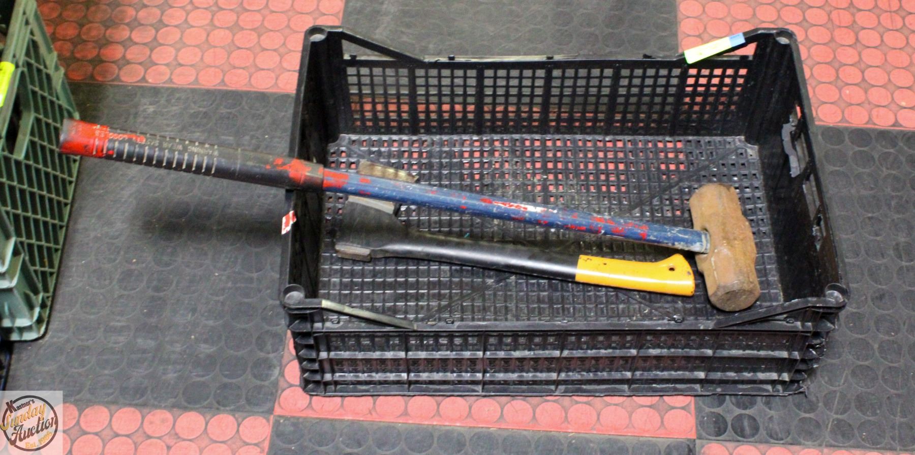 USED 8LB MALLET AND USED AXE IN BLACK CRATE