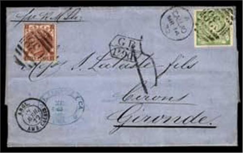 Postal History - Used Abroad: 1867-80 10d letters JI on entire to France tied by "C38" of Callao with Peru 1862 1d tied by similar cancel with Callao MR 14 72 cds alongside, nice range of transit h/s's incl GB/1f.90c" accountancy mark, horiz filing crease