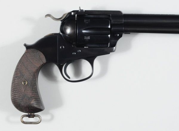 71/2" barrel, flat top, wooden checkered grips. Ser# 20966, in working condition with light rust on surface.