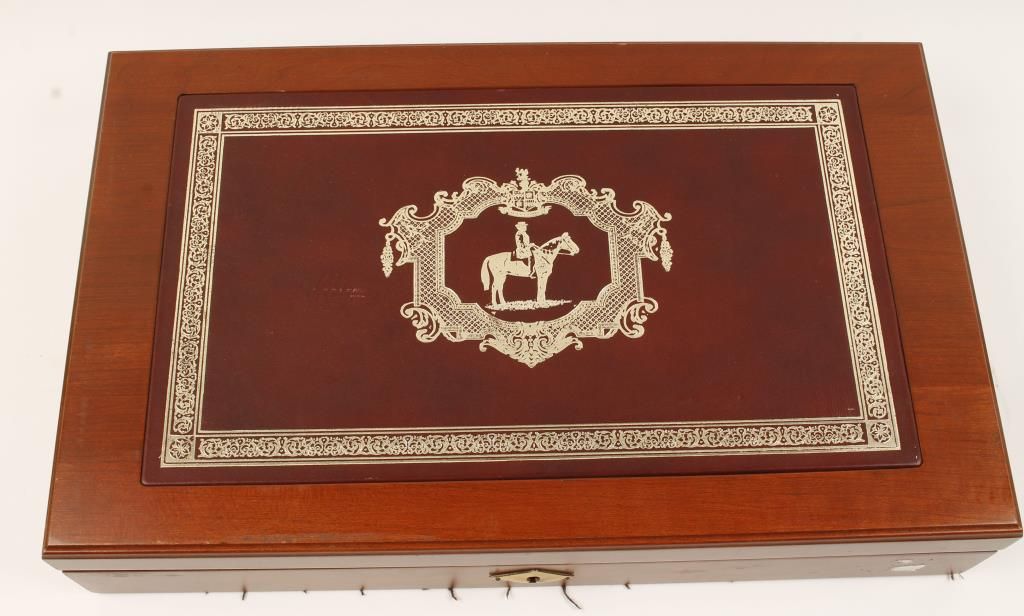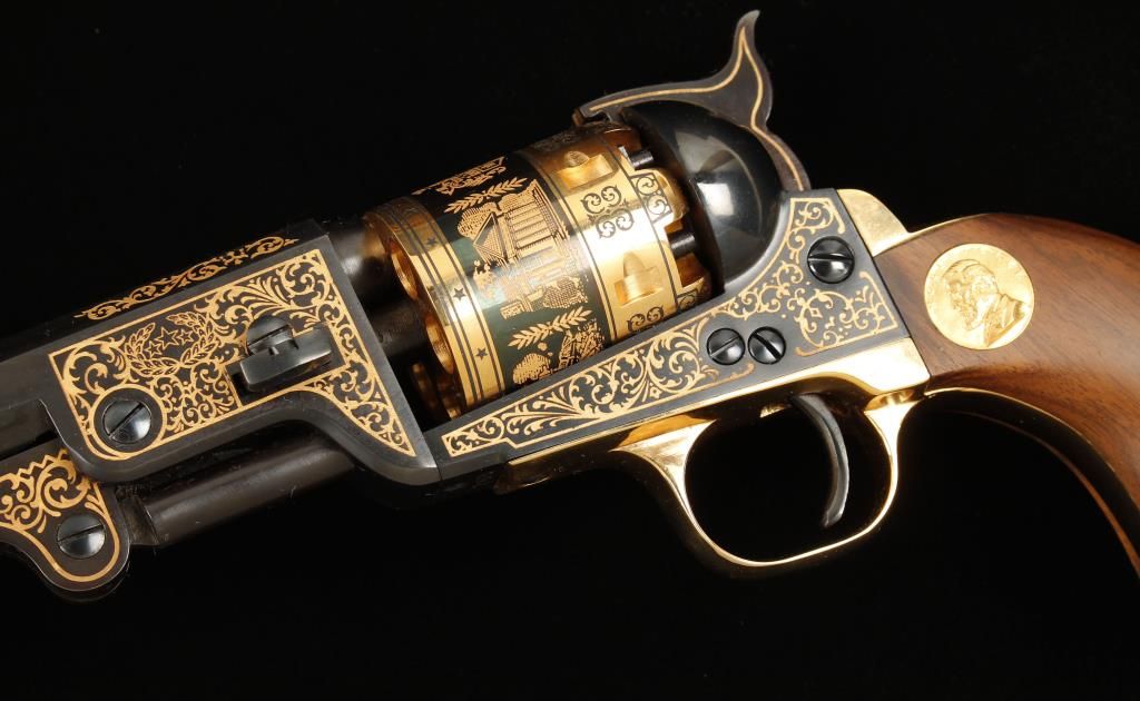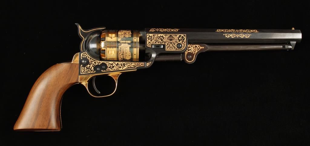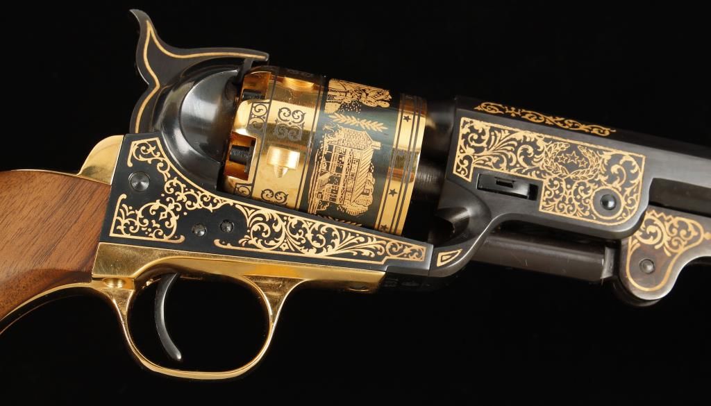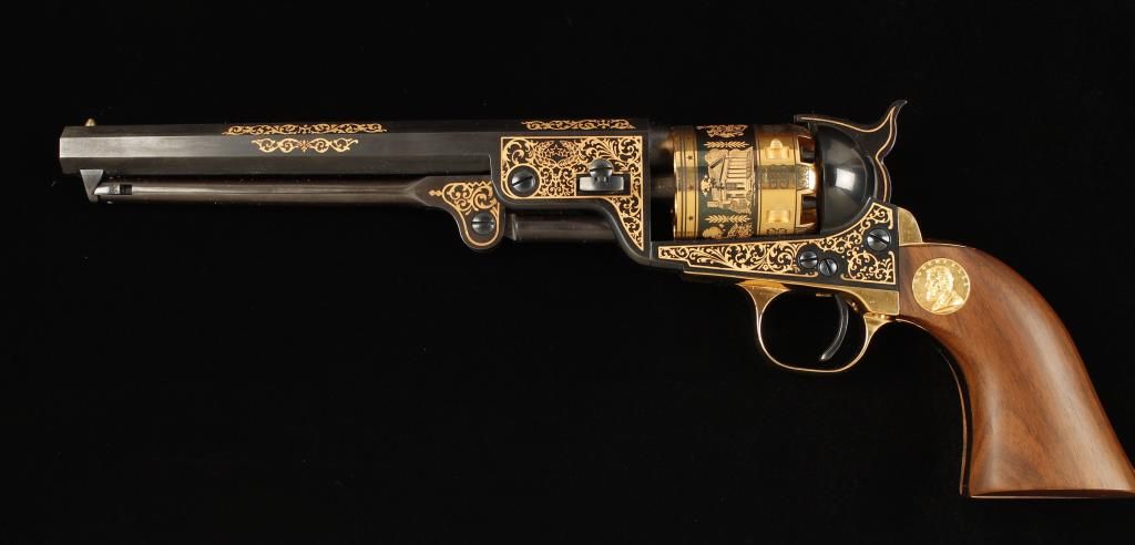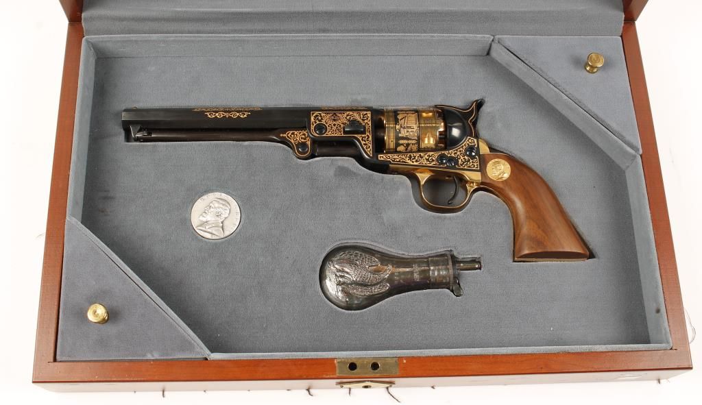 Cased Robert E. Lee commemorative revolver from the United States Historical Society. Replica black powder single action 6-shot pistol. 7-1/2" blued octagon barrel. Blued loading lever, cylinder, frame, hammer and trigger. Brass trigger guard and backstrap. Not milled for shoulder stock. Left grip has a Robt E. Lee medallion inlaid in it. Case is of American Cherry and has a leather textured insert on the lid with grey velvet lining and includes a powder flask, cap box, balls, cap box, case key and a Lee medallion. Condition is excellent. *Antique Firearm*
