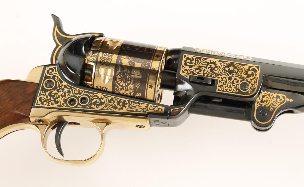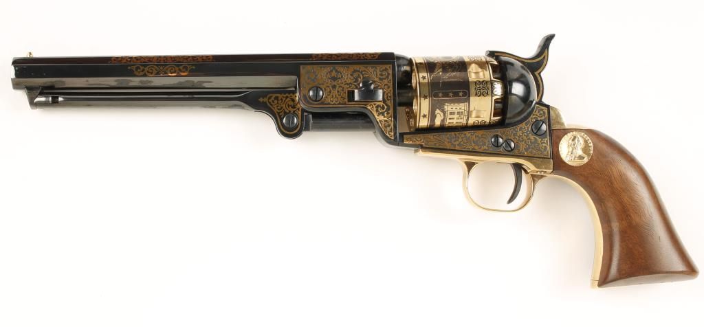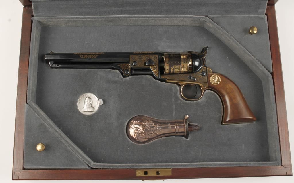 United States Historical Society cased Stonewall Jackson commemorative. Replica black powder single action 6-shot pistol. 7-1/2" blued octagon barrel. Blued loading lever, cylinder, frame, hammer and trigger. Brass trigger guard and backstrap. Not milled for shoulder stock. Gold leaf applied on barrel, loading lever, cylinder, hammer and frame. Left grip has a Stonewall Jackson medallion. The case is walnut with velvet lining. The lid has a leather texture insert showing Jackson astride a horse. Interior includes a pewter medal, powder flask, cap box, protective sleeve and key to the box. Condition is excellent. *Antique Firearm*