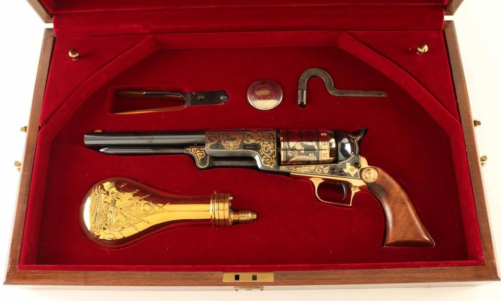 United States Historical Society highly embellished reproduction of the Colt Walker percussion revolver, commemorating the life of Sam Houston, 1793-1863, for the Texas Sesquicentennial of 1986. Features high polished blued finish, 9" barrel, blade front sight, 'v' notched rear sight on the hammer, unfluted six-shot cylinder with oval stops, loading lever, square back triggerguard, one-piece smooth walnut grip. The revolver is elaborately decorated with 24kt gold accents that commemorate the Alamo, Battle of San Jacinto, the Texas state flag, and other related symbols. A coin medallion with likeness of Sam Houston is inset on the left side of the butt. Includes a locking walnut presentation case with leather inset panel & brass rivet accents, key, bullet mold, cap box, nipple wrench, powder flask, documents and lead balls. Overall condition is like new with few signs of handling. Condition is NRA Excellent *** Antique Firearm ***