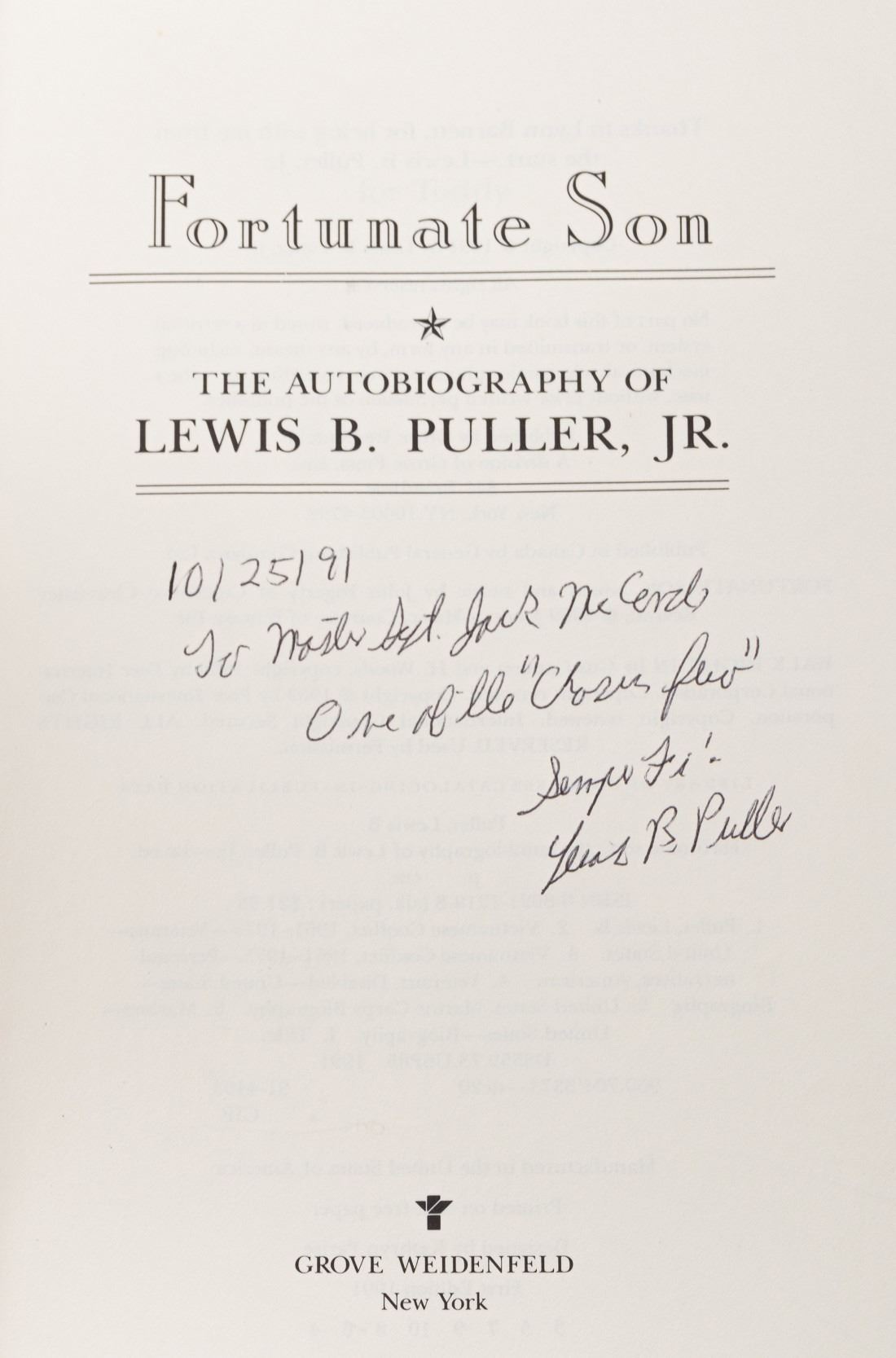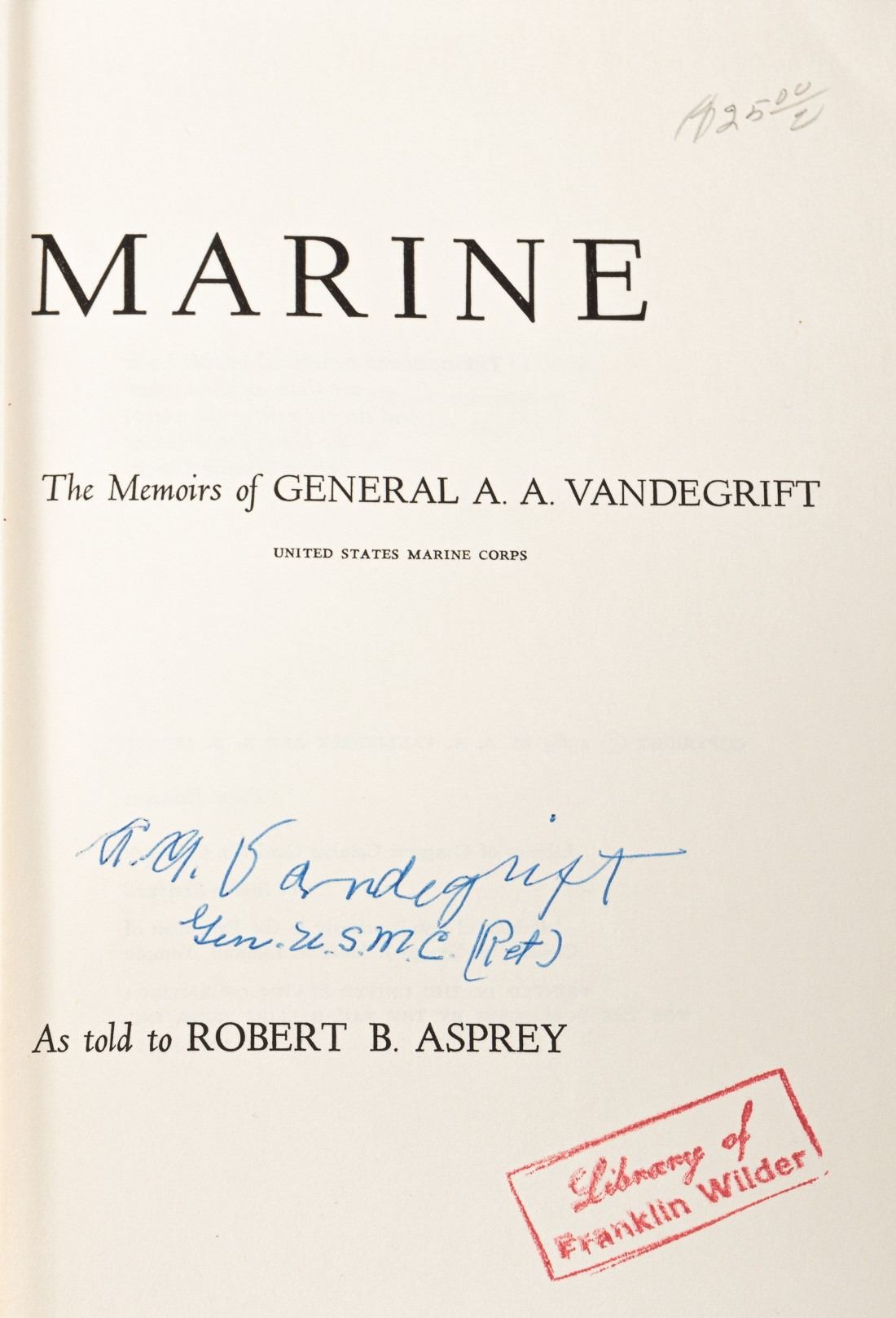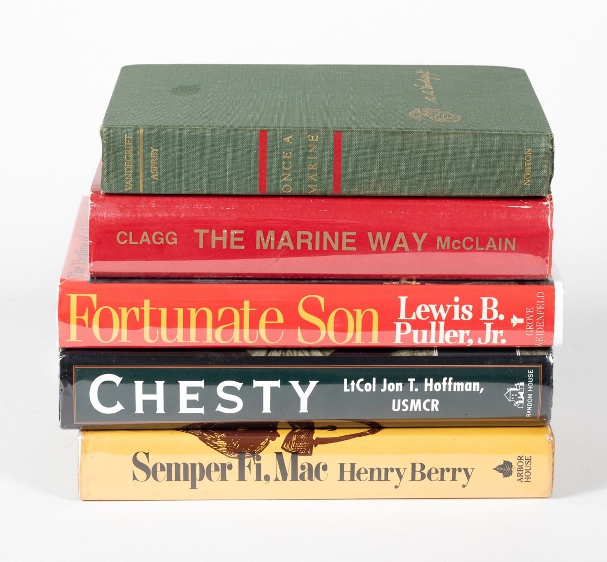 Five books signed by General A.A. Vandegrift, Colonel Sam E. Clagg, Lieutenant Lewis B. Puller, Jr., Lieutenant Colonel Jon T. Hoffman, and author Henry Berry.