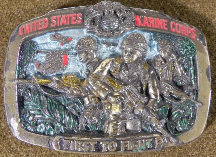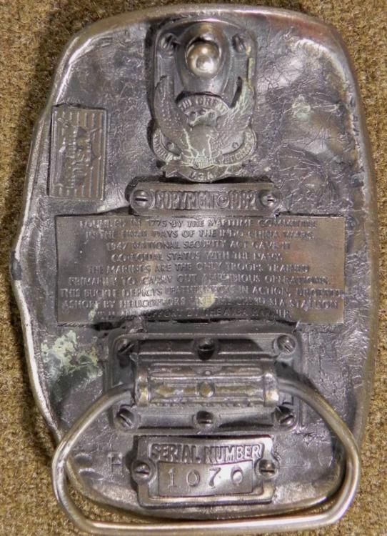 USMC/MARINE CORPS "FIRST TO FIGHT" LIMITED EDITION LARGE BELT BUCKLE FROM 1982 WITH SERIAL NUMBERS. IT HAS AN INSCRIPTION AND INSIGNIA ON THE REVERSE. *