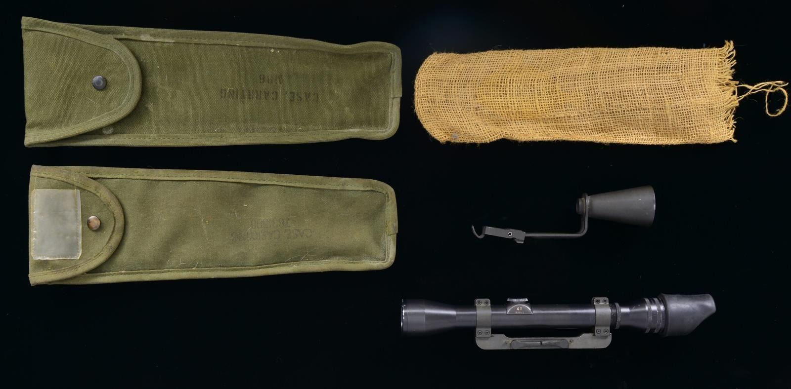 This lot consists of a Griffin & Howe MC-1 mount, Kollmorgen Bear Cub scope, 2 carrying cases, an M2 flash hider & rubber eye piece. The mount has parkerized finish w/ G& H markings, an electro pencil number "3641802", and a patent date of May 3rd, 1932. The mount shows light silvering & a few oxidation specks. The scope has Kollmorgen markings w/ a crosshair logo, the words "BEAR CUB" & a Northampton, Mass. address. The top left of scope is marked "4X" & "23591". The scope body shows scattered light flaking & handling wear. The scope has a fine crosshair reticle & very good optics. The first carrying case is marked "CASE CARRYING" & "MRT". The second is marked "CASE CARRYING M86" & "MRT". The cases show light staining & wear. The M2 flash hider is maker marked by the Hart mfg. Co. & it shows scattered light oxidation. The rear rubber piece piece shows light dust staining. PROVENANCE: from the estate collections of Charles P. Obremski. (02-16641-2/MJC). $600-800.