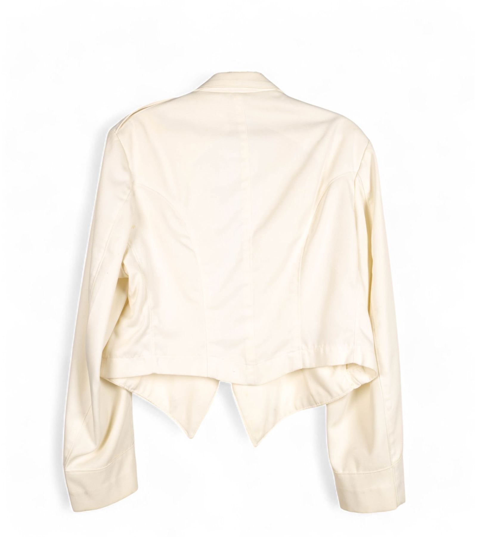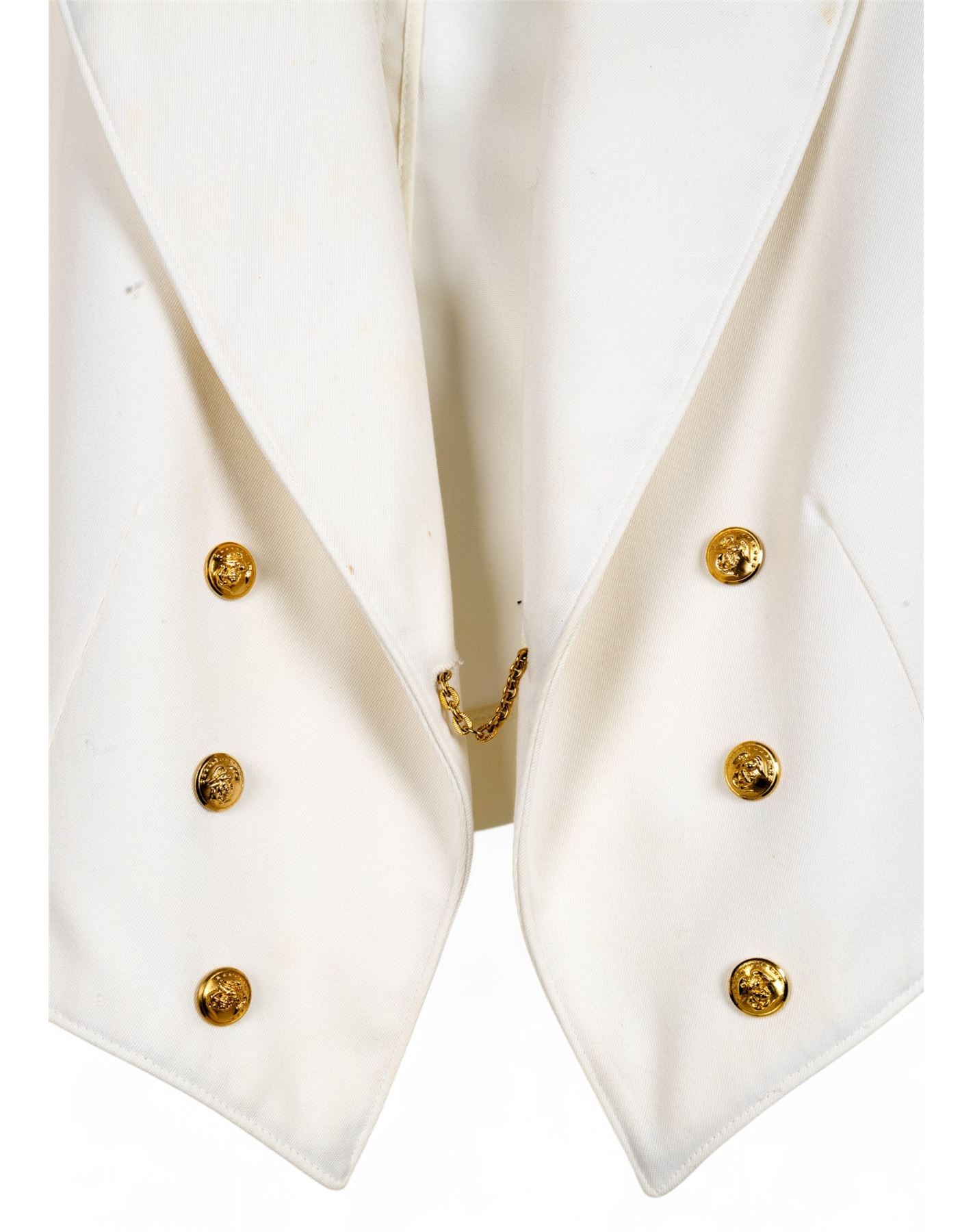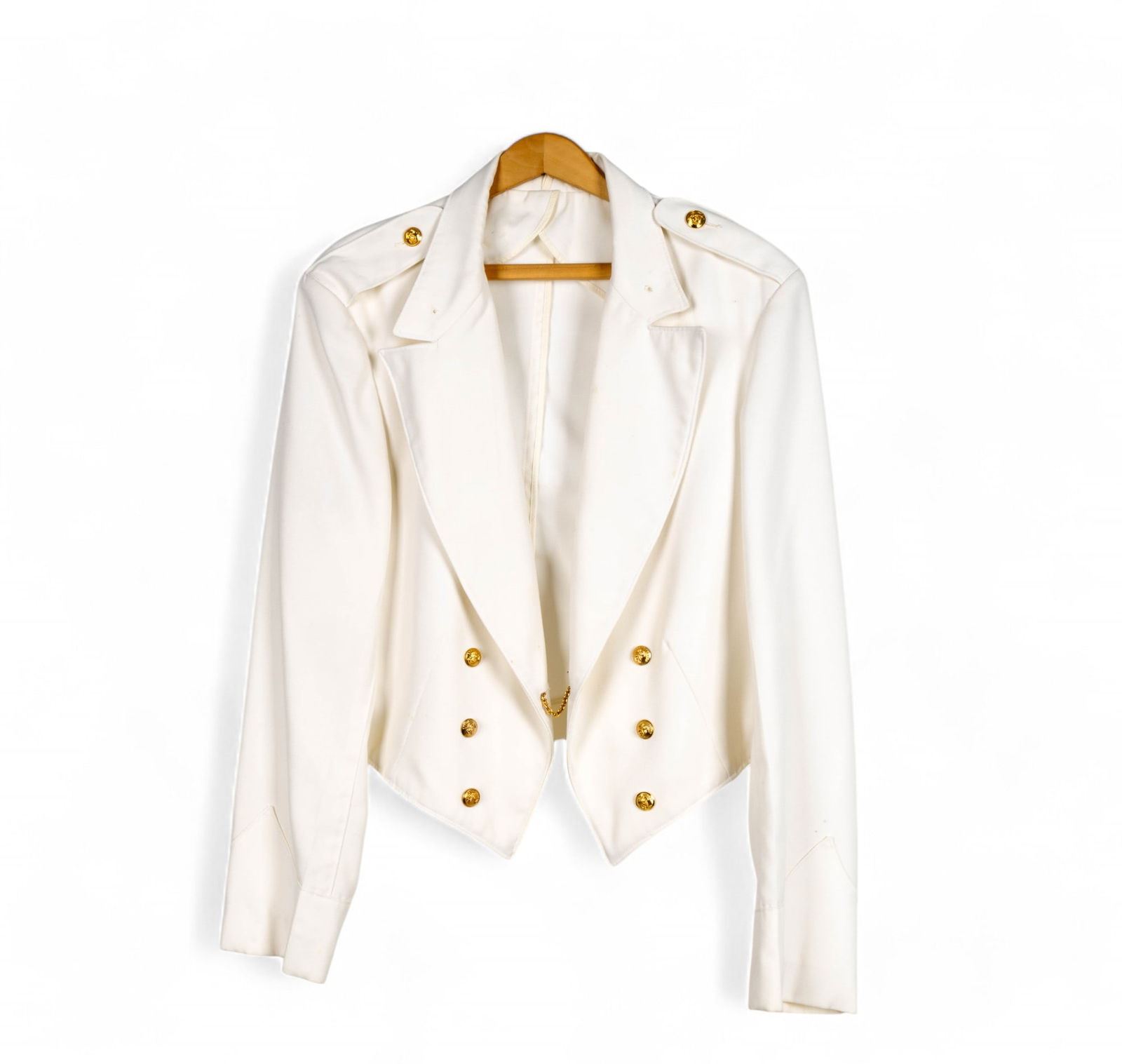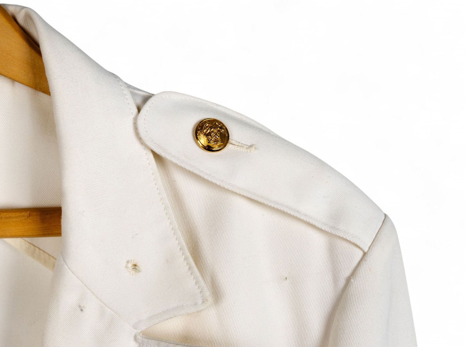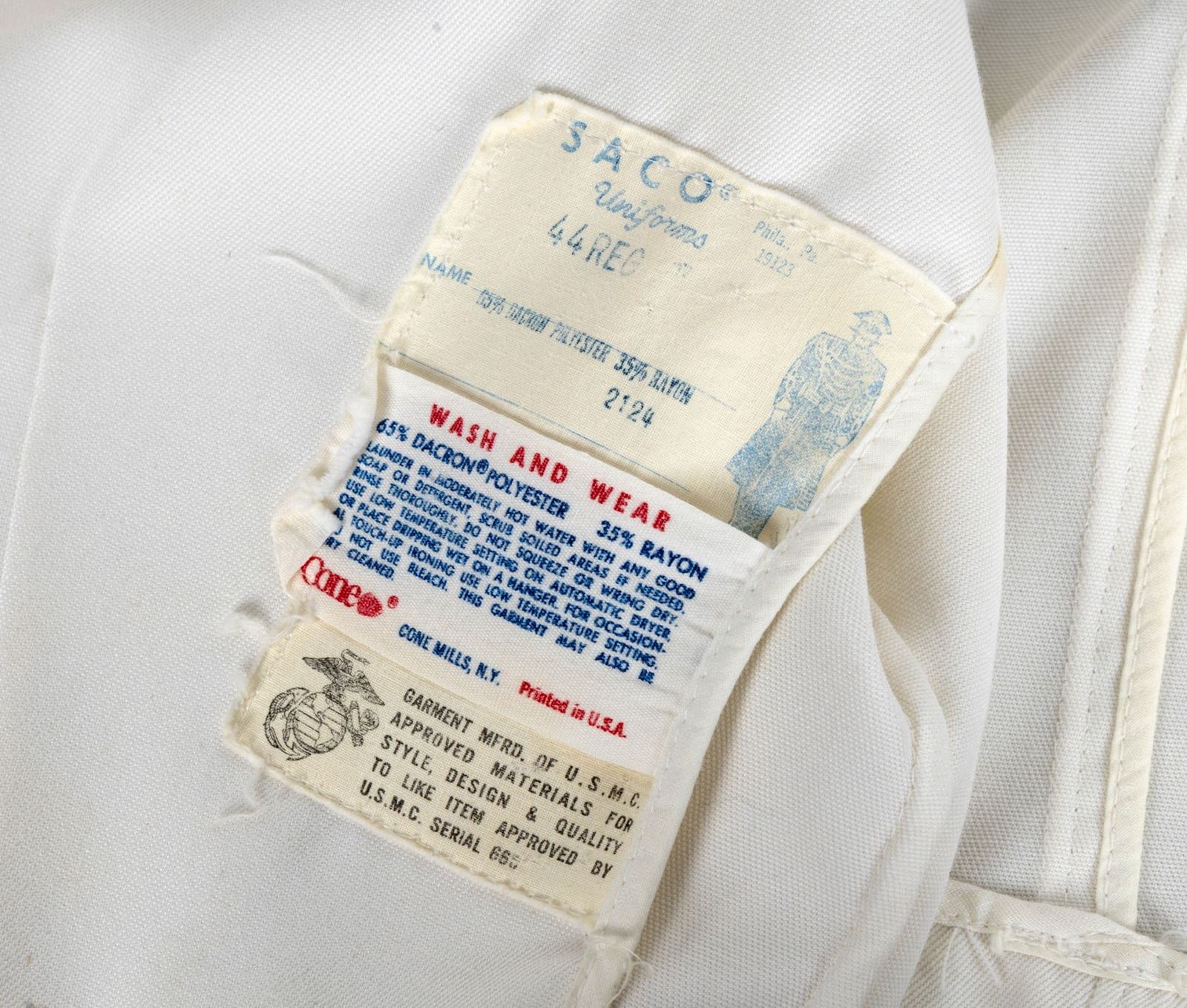 United States Marine Corps white mess dress jacket with brass globe and anchor buttons from Saco Uniforms Philadelphia, size 44 regular.