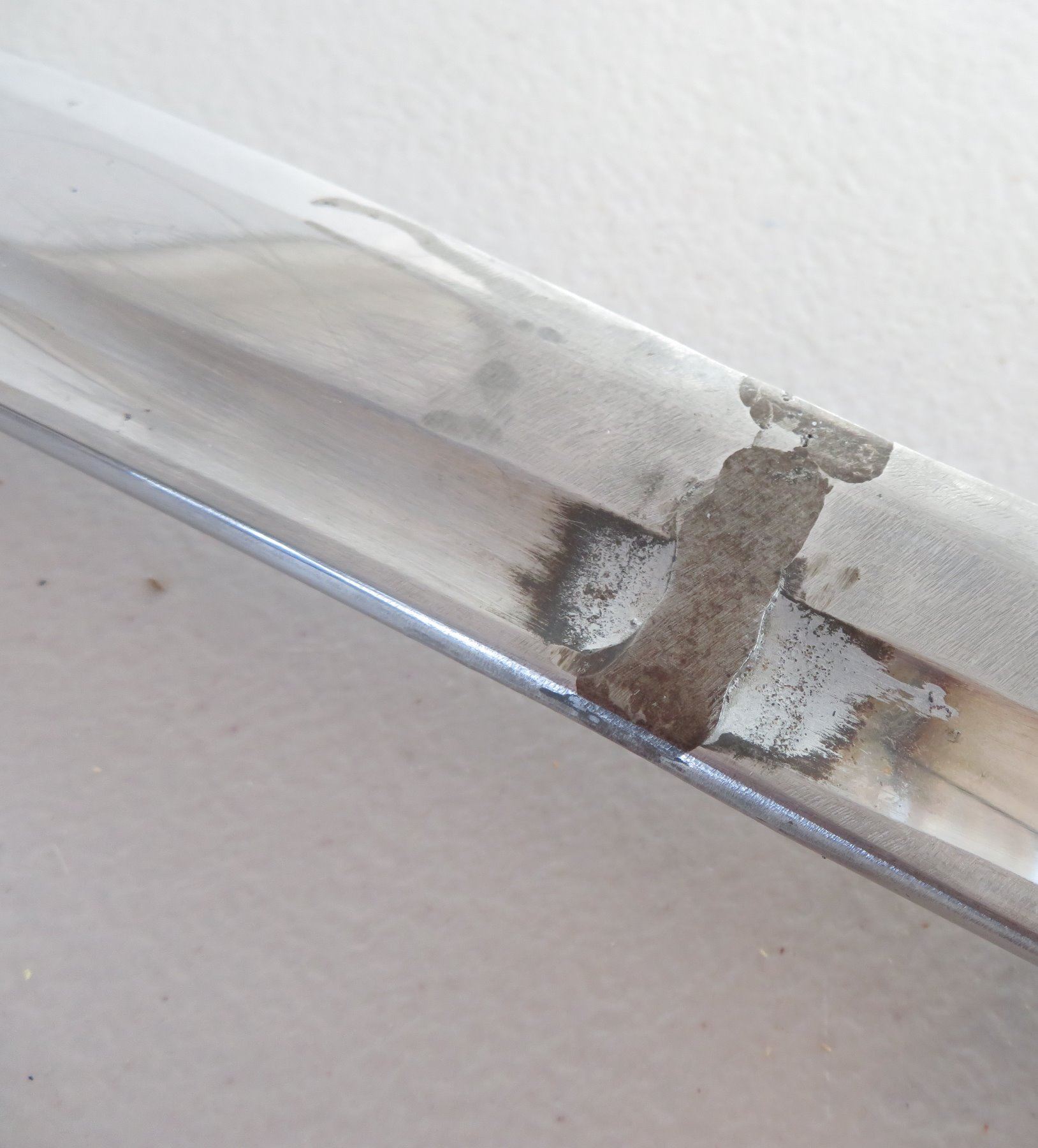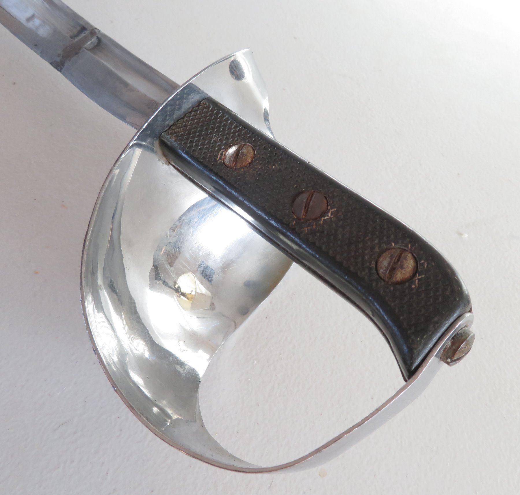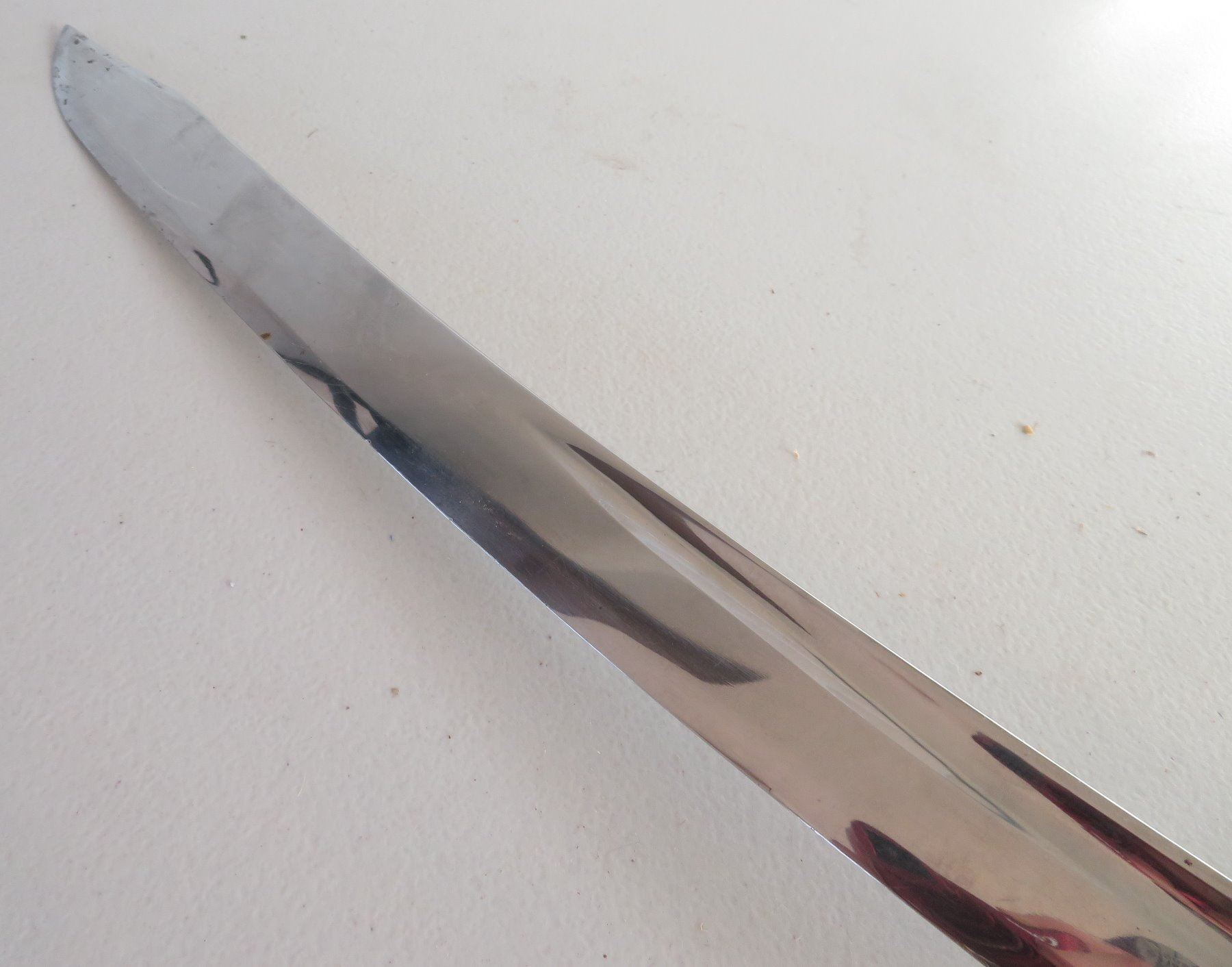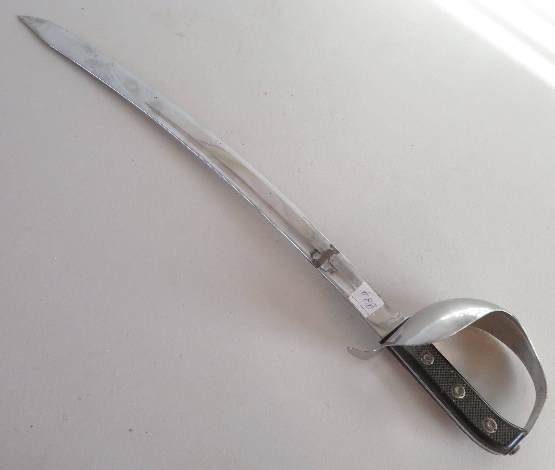 USN Cutlass, 20th century item. Made of steel, chrome and plastic, the item measures 30" x 5" x 5" long. Made in Germany. Heavy with hand guard. Condition: Cracked blade and welded, see images. Shipping: $45.00 USA estimate only, due to size and weight.