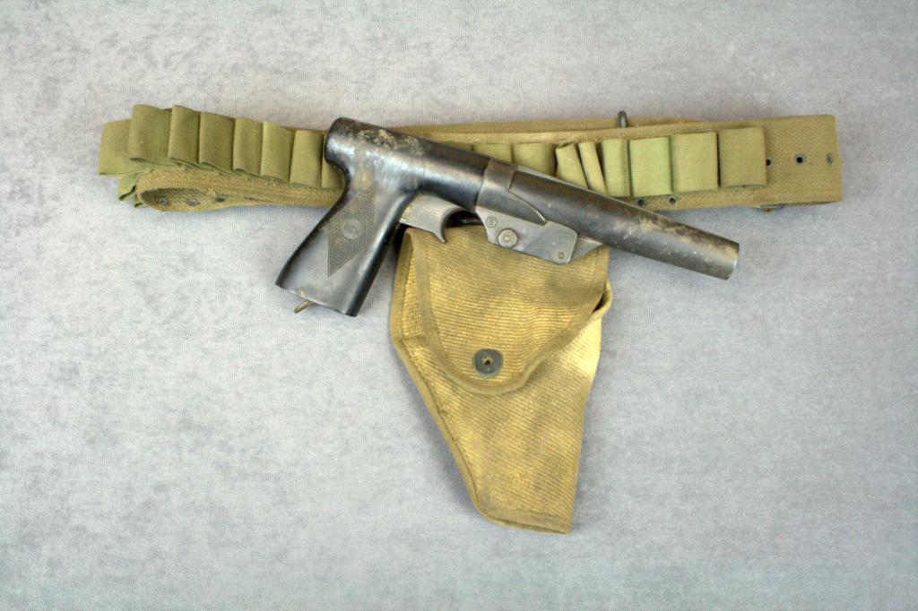 USN marked flare gun with military soft flap holster and flare cartridge belt. The flare gun is approx. 11” overall with a black composite grip, military finished break open metal barrel assembly, #242692-A-2 marked intwo places on the barrel assembly; in overall uncleaned condition, very good bore and action; the holster and belt have years of dust and dirt that should clean nicely with a little care as should the flare gun itself. Est.: $150-$300.