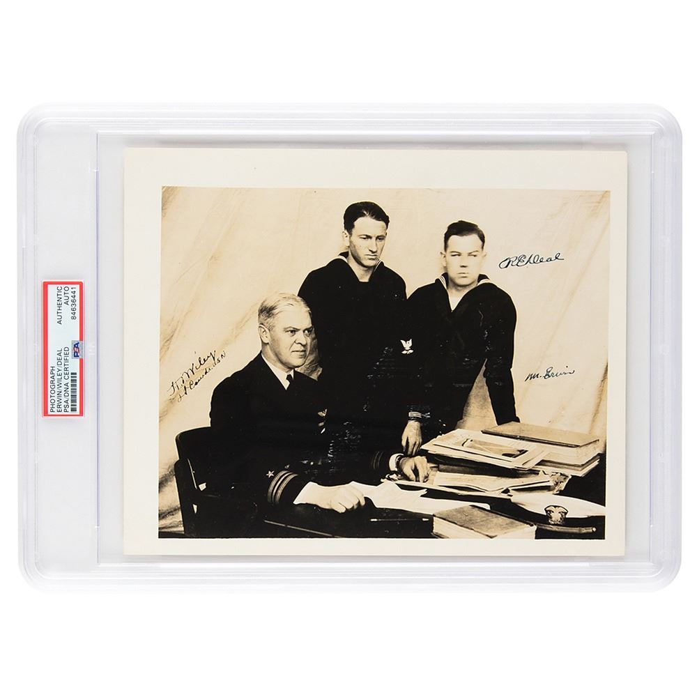 Uncommon vintage glossy 10 x 8 photo of the three survivors of the USS Akron disaster, signed in fountain pen by those pictured: Lieutenant Commander Herbert V. Wiley ("H. V. Wiley, Lt. Comdr. USN"), Boatswain's Mate Second Class Richard E. Deal ("R. E. Deal"), and Aviation Metalsmith Second Class Moody E. Erwin ("M. Erwin"). In fine condition. The accident-prone naval airship USS Akron (ZRS-4) was lost in a weather-related accident off the coast of New Jersey on April 4, 1933, killing 73 of the 76 crew and passengers on board. Encapsulated in a PSA/DNA authentication holder.