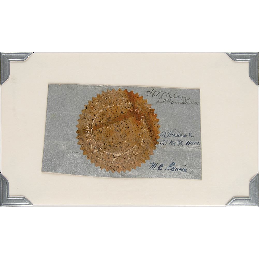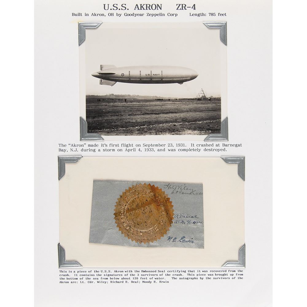 Relic swatch of the fabric skin of the USS Akron (ZRS-4) US Navy airship, 4 x 2.25, signed in ink by its three survivors: Lieutenant Commander Herbert V. Wiley, Boatswain's Mate Second Class Richard E. Deal, and Aviation Metalsmith Second Class Moody E. Erwin. The swatch bears an embossed seal of Lakewood Township, N.J. Includes a glossy 5.25 x 4 photo of the airship and an informational sheet. In fine condition. The accident-prone naval airship was lost in a weather-related accident off the coast of New Jersey on April 4, 1933, killing 73 of the 76 crew and passengers on board.