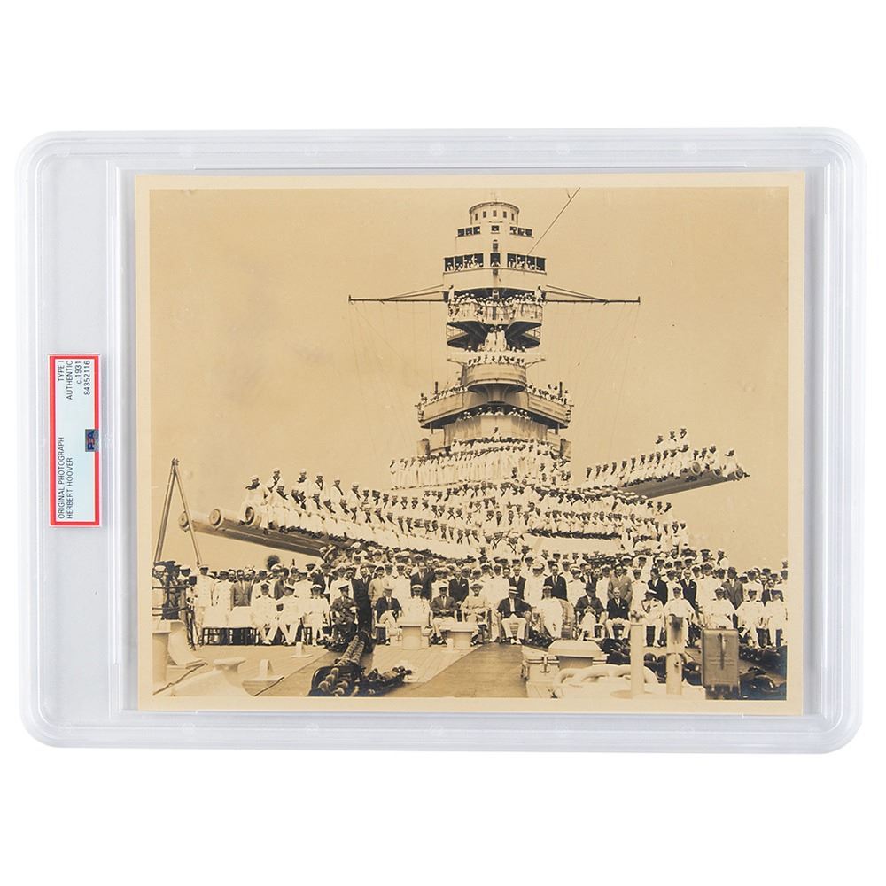 Original vintage matte-finish 10.25 x 8.5 photograph of President Herbert Hoover with the crew on board the USS Arizona, circa 1931, during a trip to Puerto Rico and the Virgin Islands. In fine condition. Encapsulated by PSA as an authentic 'Type I' photograph. The battleship had just finished a two-year overhaul and was making a 'shakedown' cruise off the east coast, so President Hoover decided to tag along for the ride; ten years later the ship would meet its tragic fate at Pearl Harbor.