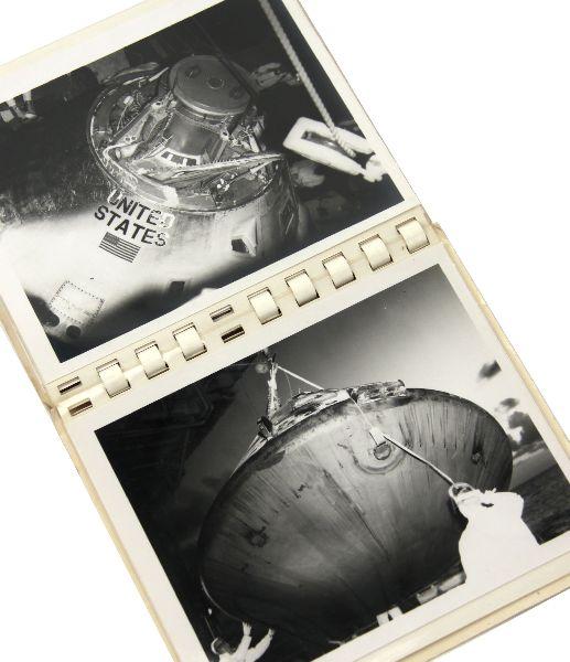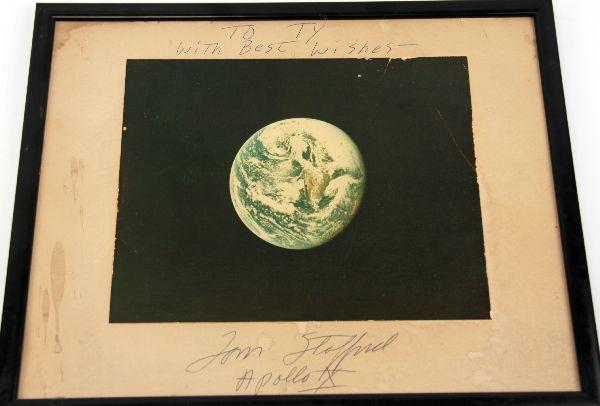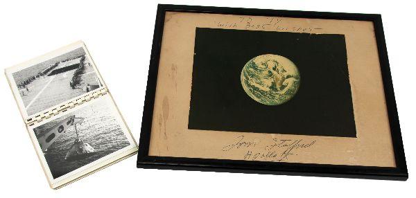 Included in this lot is a set of snapshots taken from aboard the U.S.S. Boxer during the recovery of the Feb. 1966 Apollo AS-201 test capsule. It also it also includes photos of the "shellback" ceremony on the voyage. 16 photos in all bound in a 4.75 by 5.25 booklet. Also included is an original photo of Earth taken by Tom Stafford during the Apollo 10 mission. It is mounted to a piece of artist board and framed without glass. Inscription reads " To Ty/ with best wishes/ Tom Stafford/ Apollo X". Some crazing to photo and water staining to board. Overall good condition.