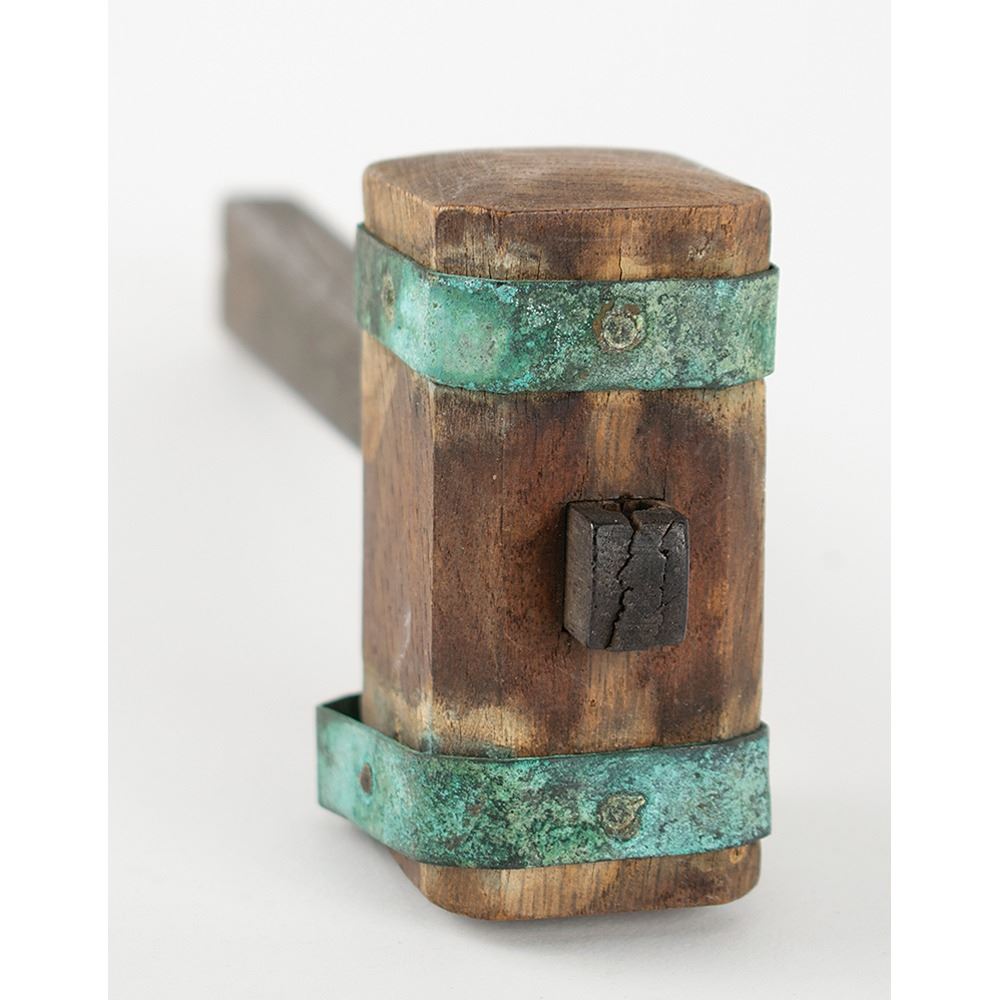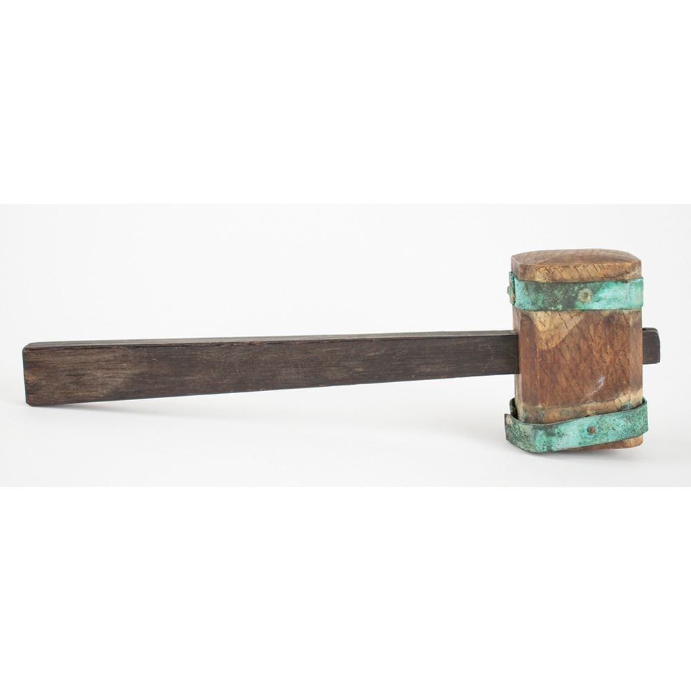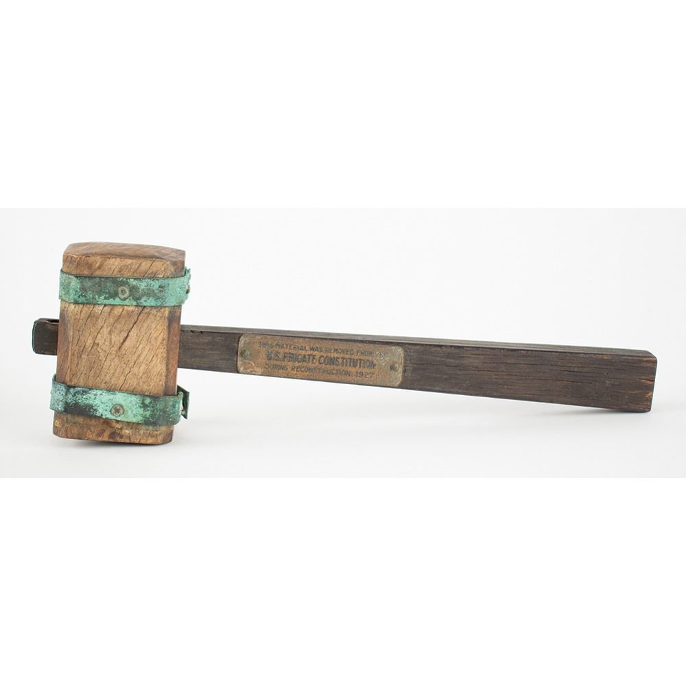 Mallet constructed of wood removed from the hull of the USS Constitution during the frigate's historic 1927 restoration, measuring 11.5˝ long with a 2˝ x 1.5˝ x 3.25˝ head, with a descriptive plate reading: "This material was removed from the U.S. Frigate Constitution during Reconstruction, 1927." In very good to fine condition, with some verdigris and heavy patina to the plate and bands on the mallet head; one of the bands has popped open and is somewhat loose. A desirable and uncommon souvenir format from the historic 1927 renovation of 'Old Ironsides.'