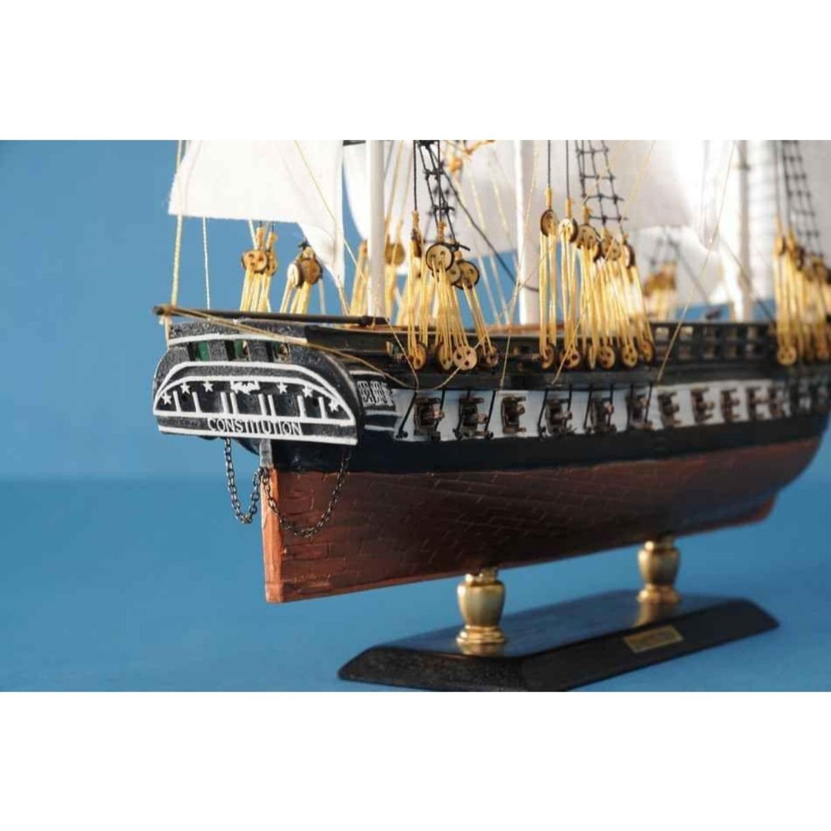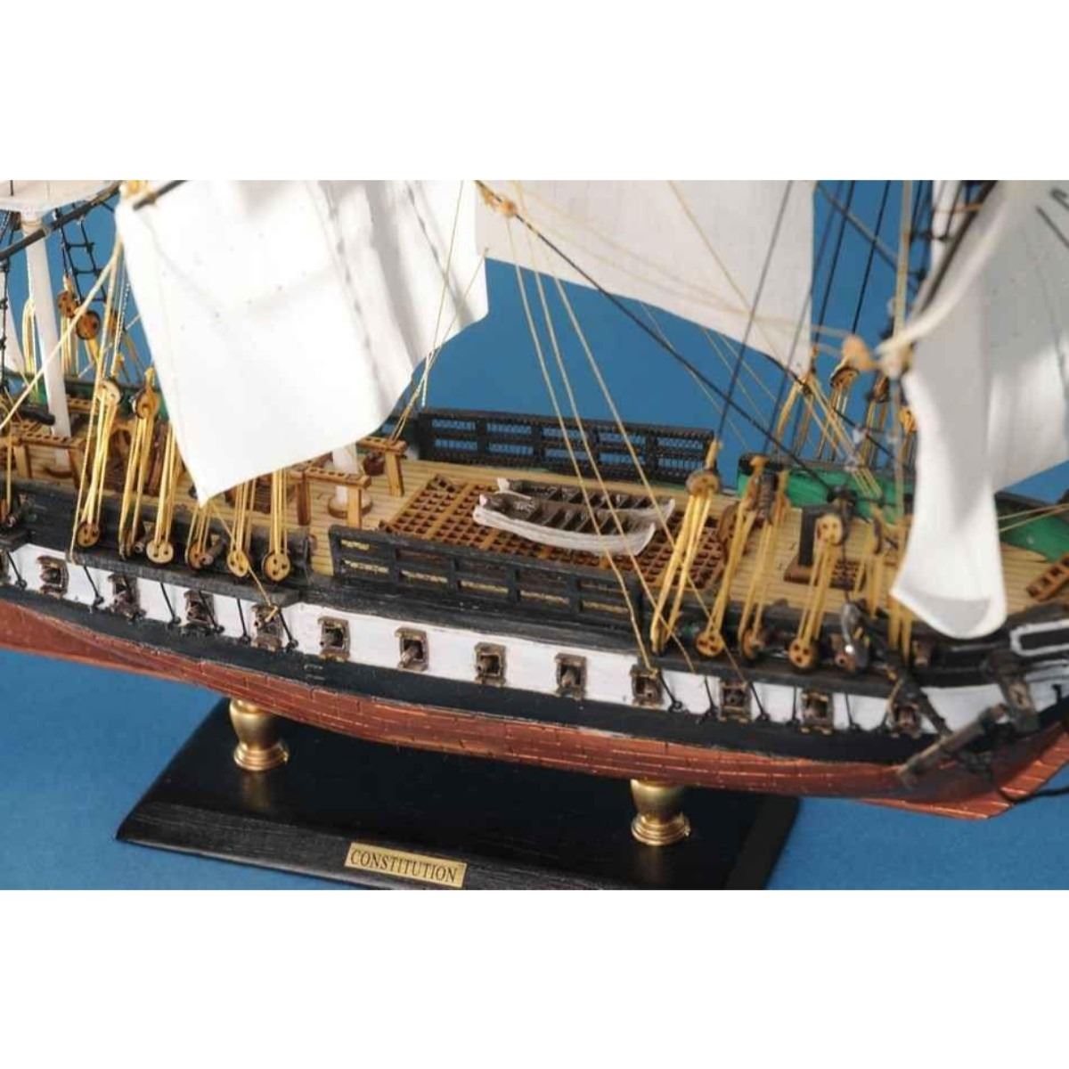 With exquisitely fine craftsmanship, unmatched features and careful attention to every detail, these scale replica tall ship models of the USS Constitution are certain to please even the most discriminating enthusiast of naval history. Whether the highlight of an office or den, or the centerpiece of a nautical themed meeting room or family living room, “Old Ironsides†will evoke wonder at her manifest detail and inspire historical pride with her indomitable spirit. 20" Long x 4" Wide x 15" High (1:64 scale) Handcrafted by our master artisans Individual copper finished plates below the waterline Museum Quality features not available in other tall ship models  Accurate beakhead design and scrollwork Detail is accurate to scale see deck features and cannon carriages  Two metal anchors weigh aside the bow Other Amazing Details, including:  Authentic scale lifeboats 22 sails hold their shape and do not wrinkle Taut rigging with varied thread gauge and color