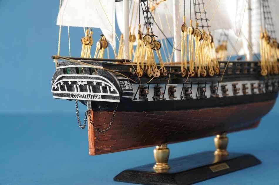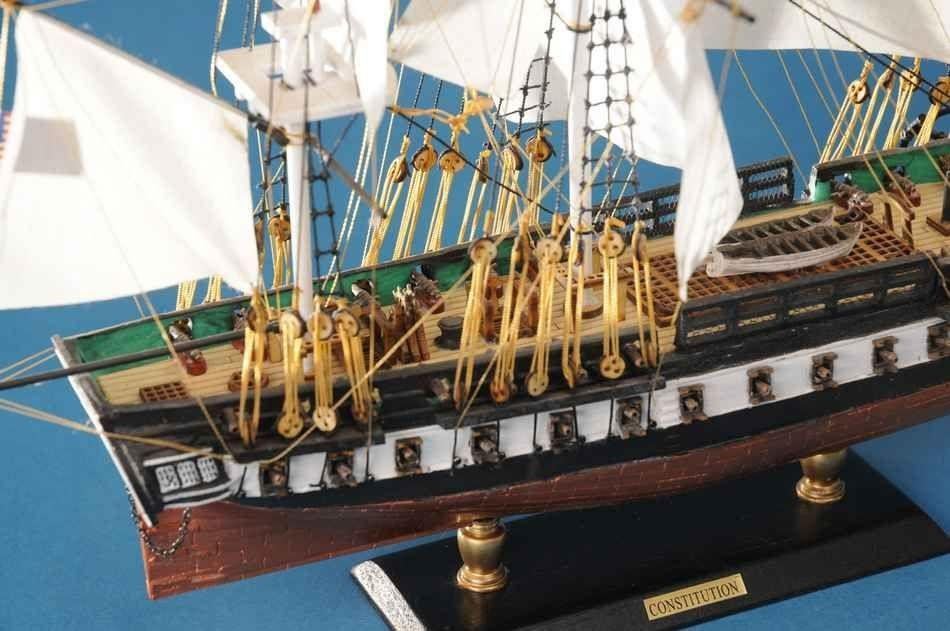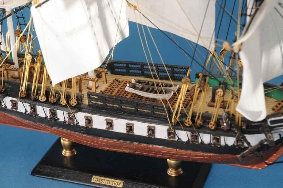 With exquisitely fine craftsmanship, unmatched features and careful attention to every detail, these scale replica tall ship models of the USS Constitution are certain to please even the most discriminating enthusiast of naval history. Whether the highlight of an office or den, or the centerpiece of a nautical themed meeting room or family living room, “Old Ironsides†will evoke wonder at her manifest detail and inspire historical pride with her indomitable spirit. 20" Long x 4" Wide x 15" High (1:64 scale) Handcrafted by our master artisans Individual copper finished plates below the waterline Museum Quality features not available in other tall ship models  Accurate beakhead design and scrollwork Detail is accurate to scale see deck features and cannon carriages  Two metal anchors weigh aside the bow Other Amazing Details, including:  Authentic scale lifeboats 22 sails hold their shape and do not wrinkle Taut rigging with varied thread gauge and color