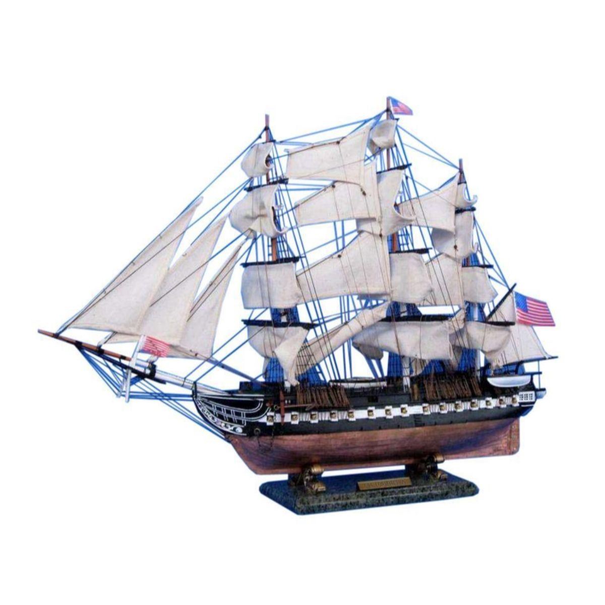 USS Constitution Limited Tall Model Ship 30" SOLD FULLY ASSEMBLED Ready for Immediate Display - Not a Model Ship kit This museum-quality Limited Edition scale replica tall ships model of “Old Ironsides†is bedecked with historically accurate features and built with the finest craftsmanship and attention to detail. As the US Navy’s oldest and most famous fighting tall ship, the USS Constitution holds a proud place in American history. Now these Limited Edition tall ship models can similarly inhabit a proud position, displaying their historical patriotism and indomitable spirit in your office, home or meeting room. 30" Long x 9" Wide x 23" High (1:82 scale) Built from scratch by master artisans Museum Quality features not available in other tall ship models under $3,000 or any kit Accurate beakhead design and scrollwork Increased detail of deck features, cannon carriages, deckwall painting and other features Handcrafted rosewood eagle on the stern Individual wooden planks used in hull construction Gun ports actually cut into the hull High quality woods include cherry, birch, maple and rosewood 300-400% more rigging than 20†model tall ships Meticulous painting accurately matches the actual USS Constitution Amazing Details, including: Planked deck with nail holes Authentic scale lifeboats Rudder chains, cannonball racks U.S. shield on the bow Solid brass cannons and metal anchors Additional deck details such as cannon balls, barrels, etc. 23 masterfully stitched, heavy canvas sails hold shape and do not wrinkle Taut rigging with varied thread gauge and color Limited production run only 100 of these tall ship models Certificate of Authenticity individually numbered and signed by HMS Founder and Master Builder Richard Norris Wooden display base features four arched dolphins Pictured with marble base (available for purchase) Extensive research of original plans, historical drawings and paintings as well as actual photographs ensures the highest possible accuracy NOTE: The copper on the hull has been replaced with individual wooden planks. In certain climates across the world the copper plating would be problematic.Â