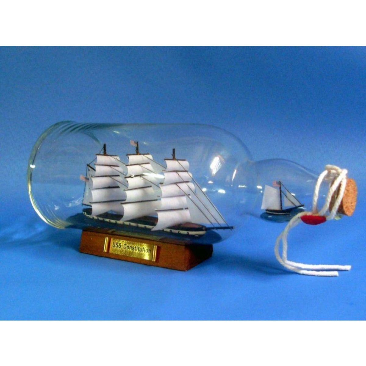 USS Constitution Model Ship in a Glass Bottle 11" FULLY ASSEMBLED – READY FOR IMMEDIATE DISPLAY This is not a Ship-in-a-Bottle kit  The ship in a bottle is one of the classic items of nautical decor, as much fun and mystery as it is remarkable craftsmanship. Now you can enjoy an adorable ship in a bottle for yourself or give one as a gift to friends, family, clients or co-workers.  11†Long x 4†Wide x 5†High Arrives fully assembled with all sails mounted --- This is not a ship in a bottle kit! Real glass bottle with a classic style Handcrafted wooden hull and masts Cork stopper and melted wax with an anchor impression seal the bottle Metal nameplate on wooden base identifies the ship as the USS Constitution