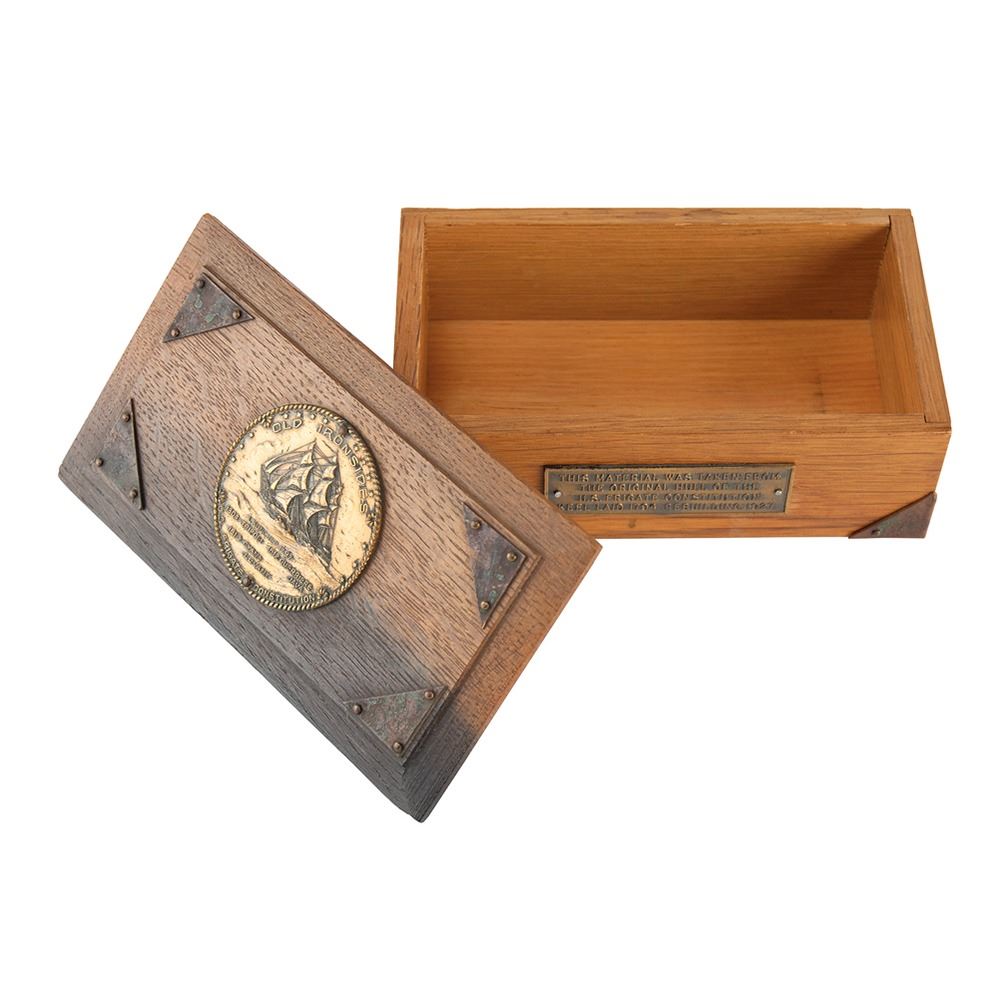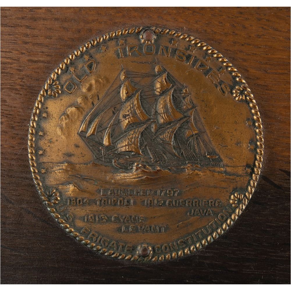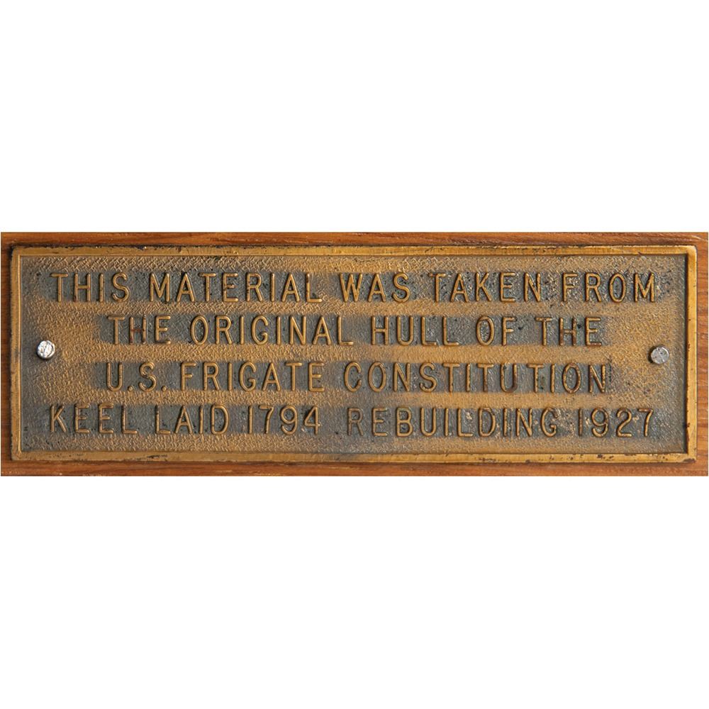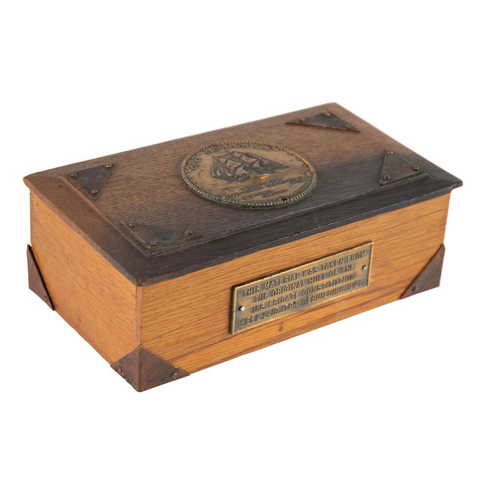 Very attractive display box constructed of wood removed from the hull of the USS Constitution during the frigate's historic 1927 restoration, measuring 7.25 x 4.25 x 2.5, with the box front bearing the original bronze plate, which reads: "This material was taken from the original hull of the U.S. Frigate Constitution, Keel laid 1794, Rebuilding 1927." The handsome box lid features a 2.5‰Û_ diameter bronze emblem with embossed image of ‰ÛÏOld Ironsides‰Û with its sails up, with raised text below: "Launched 1797, 1804 Tripoli, 1812 Guerriere, Java, 1813 Cyane, Levant, U.S. Frigate Constitution." This particular lid is interesting as the lower third is darkened, showing where the waterline was against the hull of the USS Constitution for its first 130 years of existence. In fine condition.