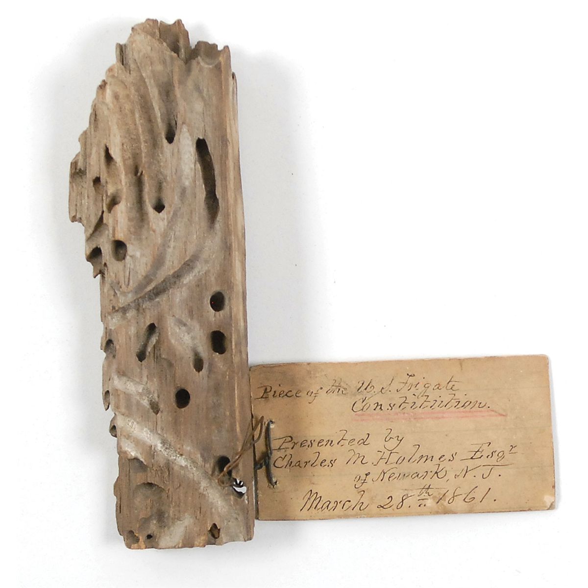 Fragment of wood from the USS Constitution, measuring approximately 5 x 1.5 x .75, bearing a period cardstock tag attached by wire, reading: “Piece of the U. S. Frigate Constitution. Presented by Charles M. Holmes Esqr of Newark, N. J. March 28th 1861.” In fine condition, with various worm holes. Originates from the John S. Reigart Collection of Historical American Relics; he spent the latter half of the 19th century assembling a comprehensive collection inclusive of every period of America’s history, tracking the provenance of his pieces by attaching neatly penned tags, as seen here. A choice artifact from the world's oldest commissioned naval vessel.