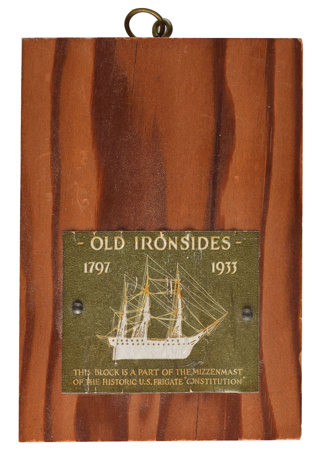 Block of wood removed from the mizzenmast of the USS Constitution during her wintering in San Diego, California in 1933; as part of the frigate's 1931–1934 tour of the U.S. coastline, the Constitution frigate underwent repairs in San Diego before making the return voyage to her homeport of Boston, Massachusetts. The block measures 3.25 x 4.75 x .5, features a metal loop for hanging to the top edge, and the front is nailed with a small descriptive plaque: "This block is a part of the mizzenmast of the historic U.S. frigate 'Constitution.'" In fine condition.